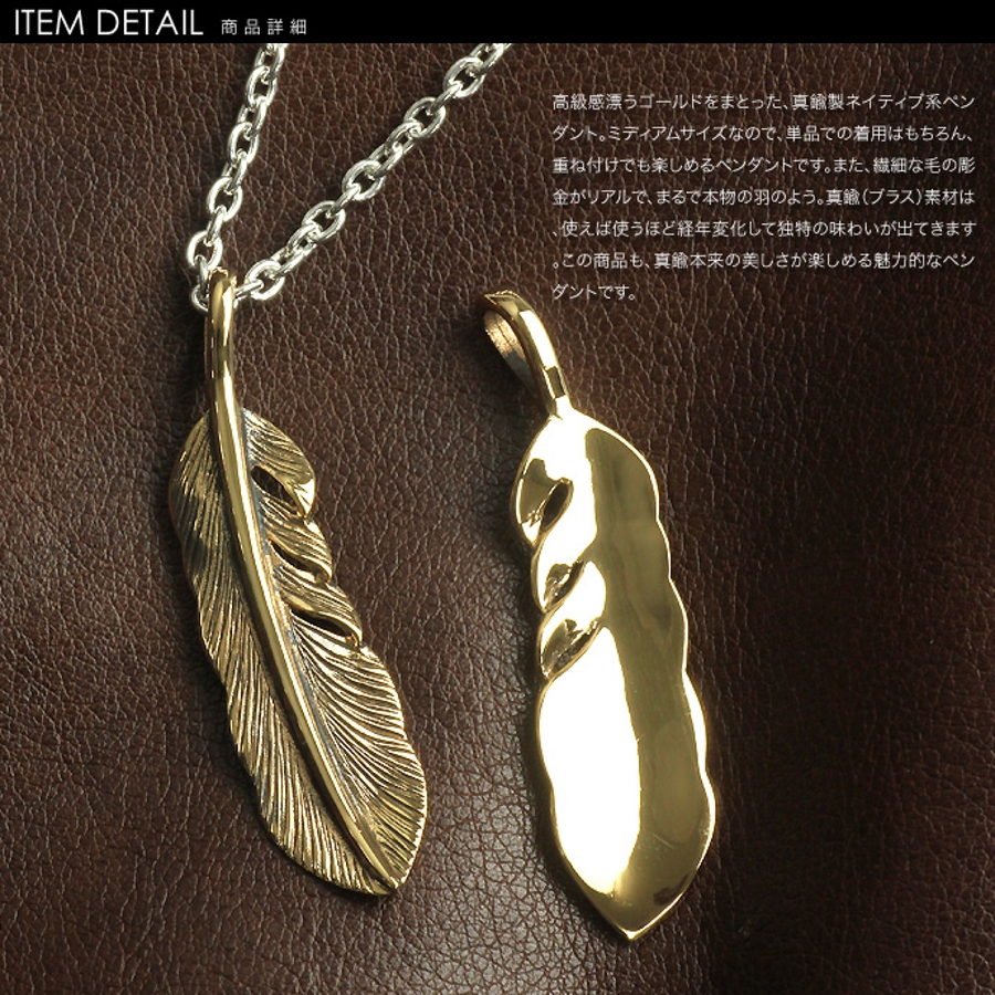 高級感漂うゴールドをまとった、真鍮製ネイティブ系ペンダント。ミディアムサイズなので、単品での着用はもちろん、重ね付けでも楽しめるペンダントです。また、繊細な毛の彫金がリアルで、まるで本物の羽のよう。真鍮(ブラス)素材は、使えば使うほど経年変化して独特の味わいが出てきます。この商品も、真鍮本来の美しさが楽しめる魅力的なペンダントです。