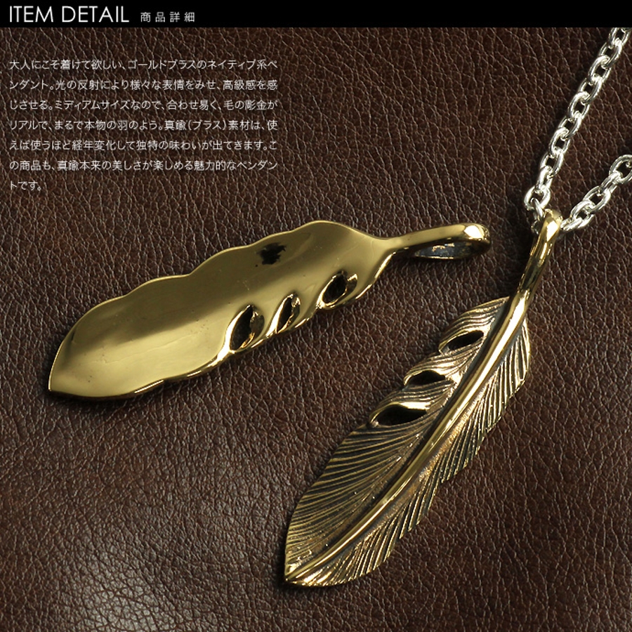 大人にこそ着けて欲しい、ゴールドブラスのネイティブ系ペンダント。光の反射により様々な表情をみせ、高級感を感じさせる。ミディアムサイズなので、合わせ易く、毛の彫金がリアルで、まるで本物の羽のよう。真鍮(ブラス)素材は、使えば使うほど経年変化して独特の味わいが出てきます。この商品も、真鍮本来の美しさが楽しめる魅力的なペンダントです。