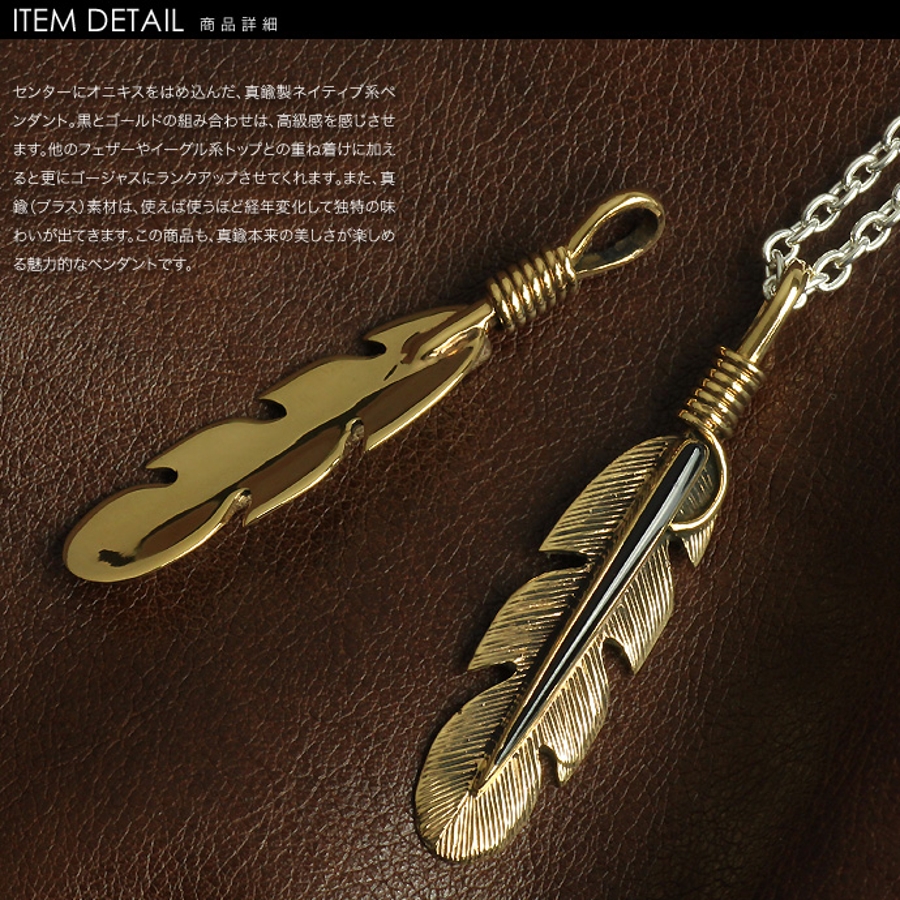 センターにオニキスをはめ込んだ、真鍮製ネイティブ系ペンダント。黒とゴールドの組み合わせは、高級感を感じさせます。他のフェザーやイーグル系トップとの重ね着けに加えると更にゴージャスにランクアップさせてくれます。また、真鍮(ブラス)素材は、使えば使うほど経年変化して独特の味わいが出てきます。この商品も、真鍮本来の美しさが楽しめる魅力的なペンダントです。