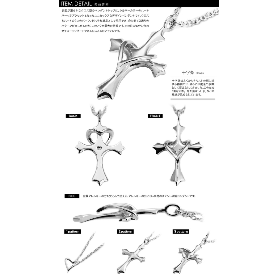 表面が滑らかなクロス型のペンダントトップに、シルバーカラーのハートパーツがアクセントとなったユニセックスなデザインペンダントです。クロスとハートの2つのパーツ、それぞれ単品として使用でき、合わせて3通りのパターンが楽しめるのが、このアクセ最大の特徴です。その日の気分に合わせてコーディネートできるおススメのアイテムです。