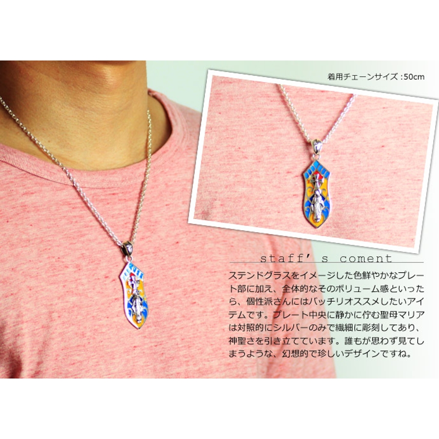 エポキシ樹脂によって再現されたステンドグラス風の美しいデザインで、幻想的な教会の風景をイメージさせる繊細さとカラーリングの大胆さを合わせ持った個性派にオススメのデザイン。中央のクロスとマリアの頭上には、ジルコニアで再現された星が輝きます。バチカンの幅も広く、様々なチェーンに合わせてお使い頂けます。