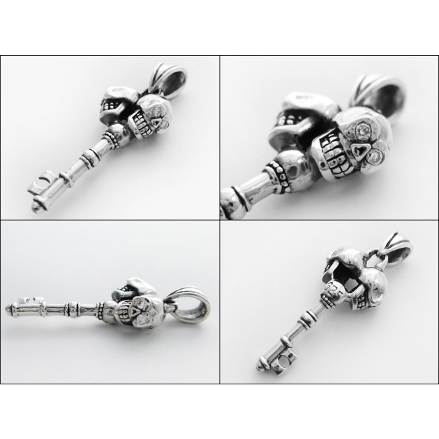 キーモチーフのシルバーペンダント。扉や金庫など何かを開ける鍵の上部には前後を見張る様にスカルの目(ジルコニアをセット)が光っています。開ける≒見張るの反する物を組み合わせた珍しいコンセプトのアクセです。