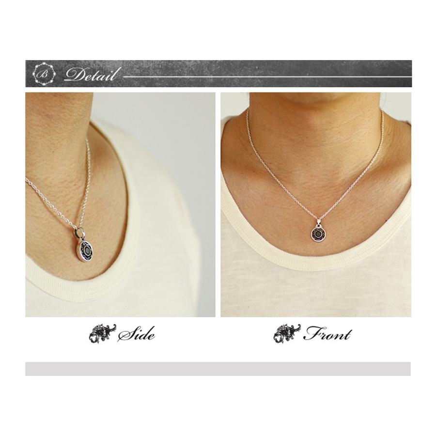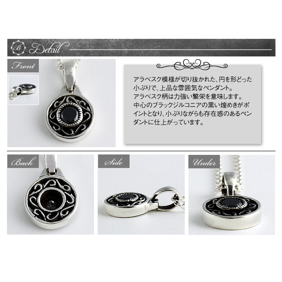 アラベスク模様が切り抜かれた、円を形どった小ぶりで上品な雰囲気なペンダント。アラベスク柄は力強い繁栄を意味します。中心のブラックジルコニアの黒い煌めきがポイントとなり、小ぶりながらも存在感のあるペンダントに仕上がっています。