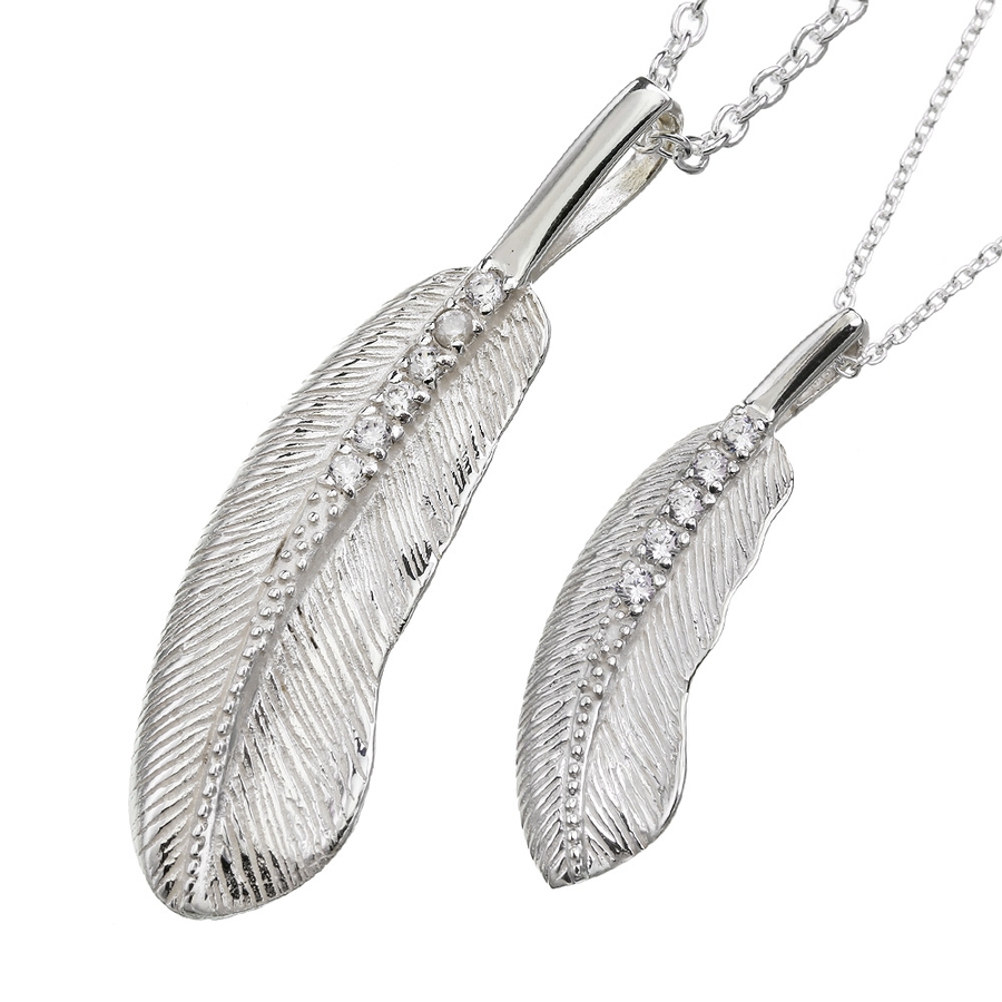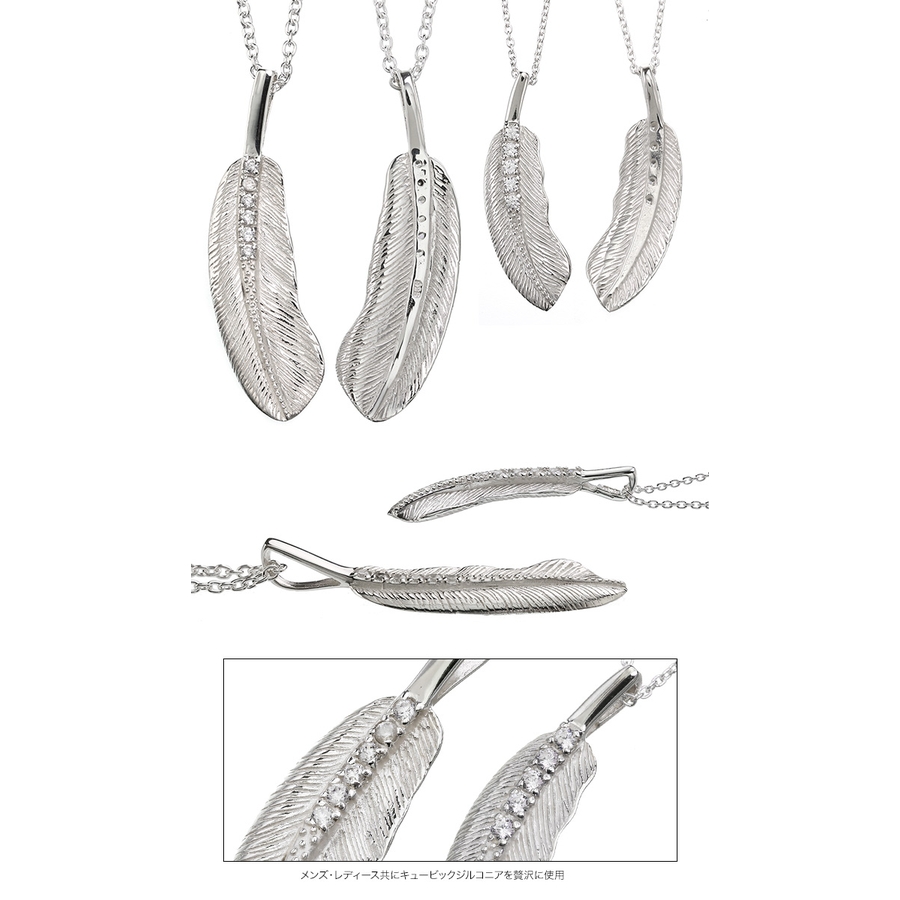 本物の羽根を見事に再現し、ジルコニアをさり気なくセットしたペアペンダント。シルバー素材独特の繊細さに、ハンドメイドだからこそできる細やかな彫刻は、柔らかな感触を感じさせます。裏面まで抜かりなく彫り込みが施され、採光穴を設けることで光を取り込みジルコニアが輝きます。