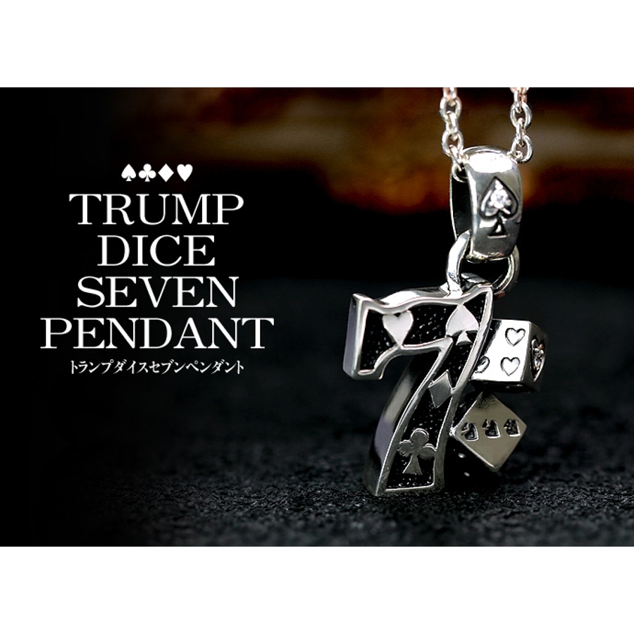 大きな「7」の数字にサイコロを立体的にセット、トランプ柄が各所にちりばめられ、ギャンブラーのラッキーアイテムとなりそうなペンダントです。さりげなくジルコニアがセットされており華やかなデザインになっています。