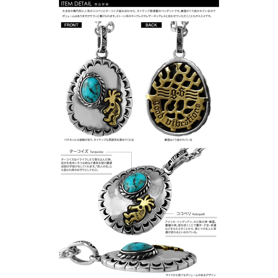 大き目の楕円形に人気のココペリとターコイズ組み合わせた、ネイティブ感満載のペンダントです。裏面がくり抜かれているので、ボリュームはありますがサラッと着けられます。ストーン系のネックレスやレザーネックレスと合わせていただくこともオススメです。