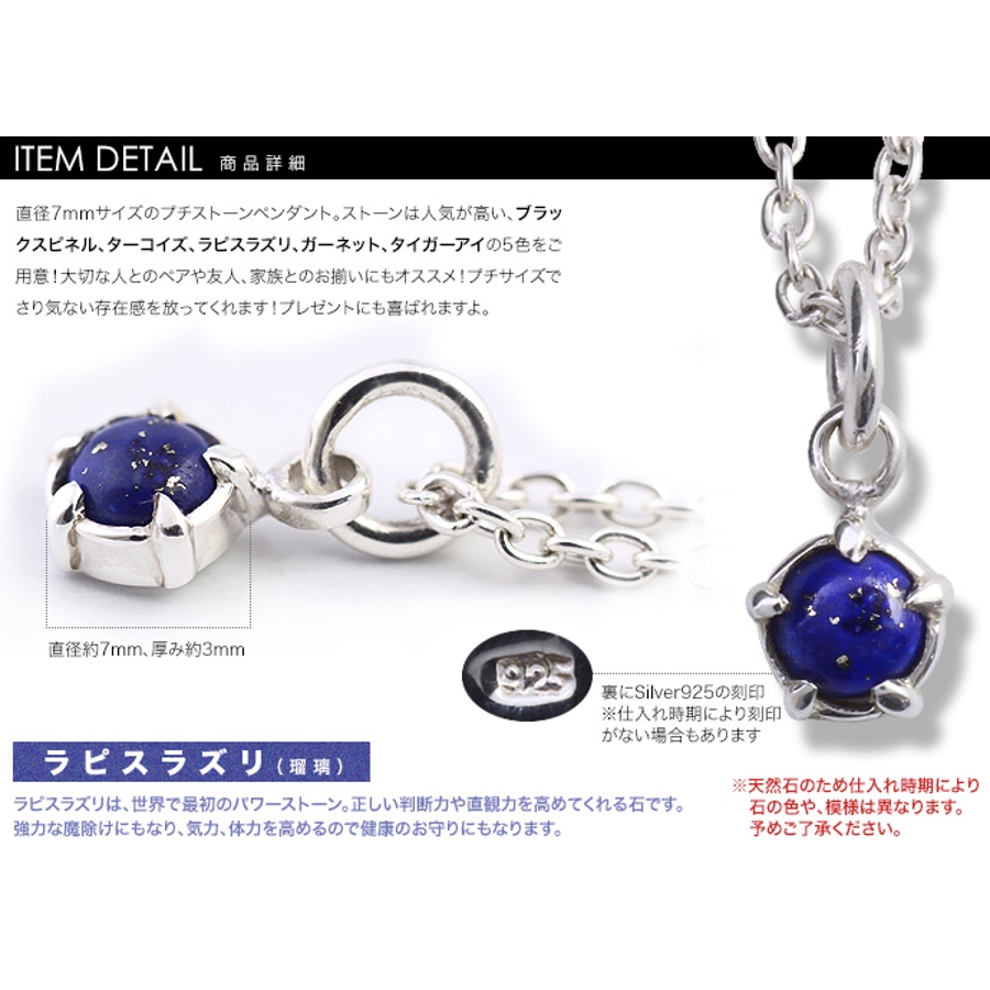 直径7mmサイズのプチストーンペンダント。ストーンは人気が高い、ブラックスピネル、ターコイズ、ラピスラズリ、ガーネット、タイガーアイの5色をご用意!大切な人とのペアや、友人・家族とのお揃いにもオススメ!プチサイズでさり気ない存在感を放ってくれます♪プレゼントにも喜ばれますよ。