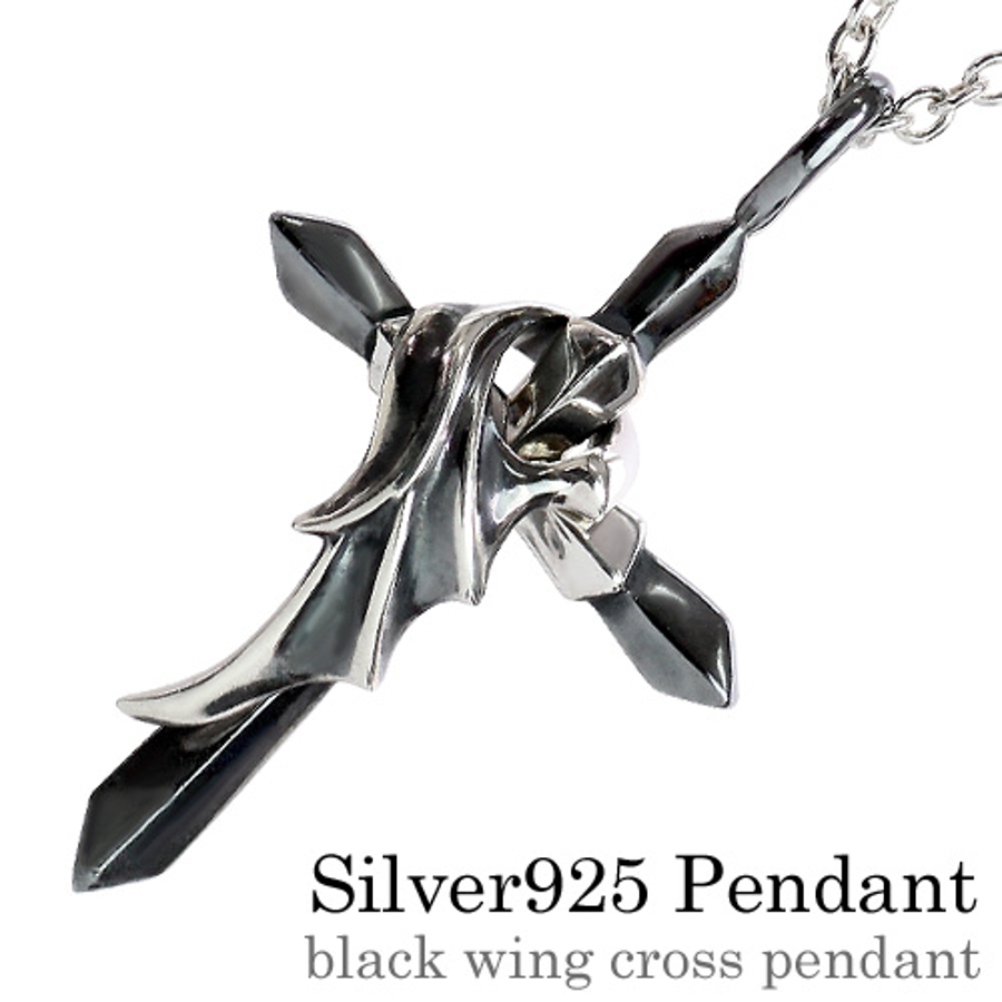 ブラックウィングクロスペンダントトップのみメンズネックレスシルバー925アクセサ…