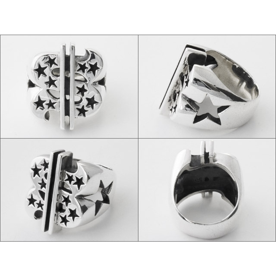 前面の縦幅が25mmのインパクトのあるリング。前面のドルマークには星が散りばめられ、リング側面には星型がくり抜かれているポップな作品。このリングは大きいサイズですが裏抜き加工が施されているので着けやすくなっています。