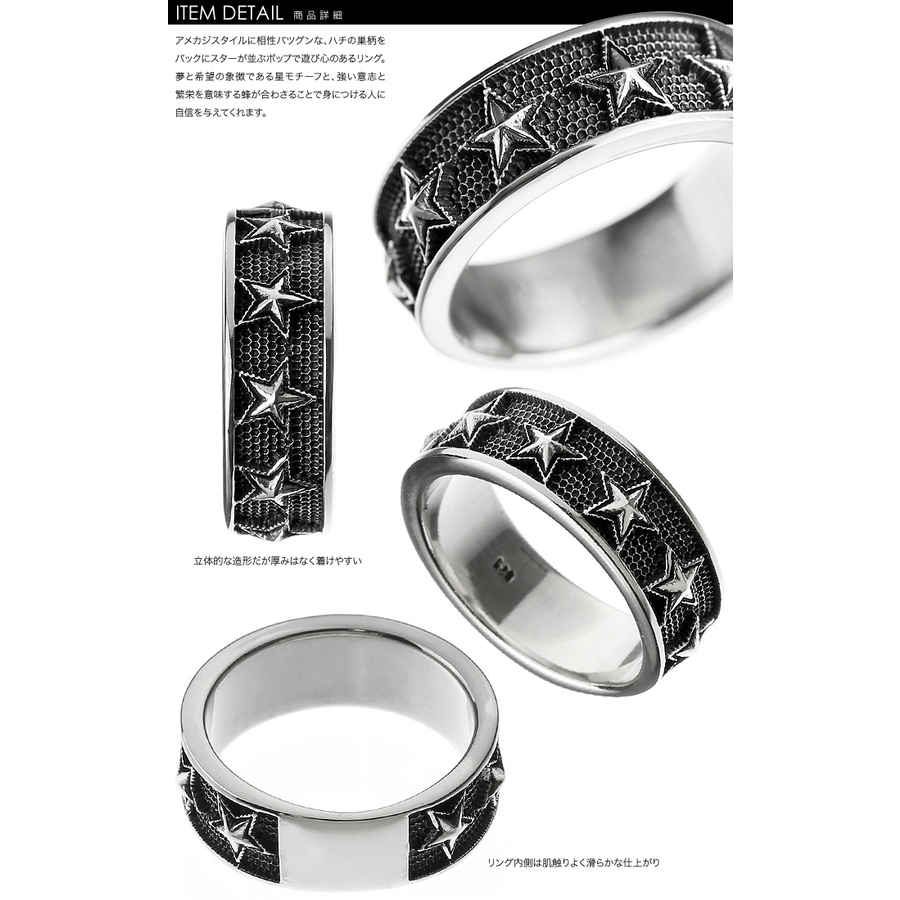 アメカジスタイルに相性バツグンな、ハチの巣柄をバックにスターが並ぶポップで遊び心のあるリング。夢と希望の象徴である星モチーフと、強い意志と繁栄を意味する蜂が合わさることで身につける人に自信を与えてくれます。