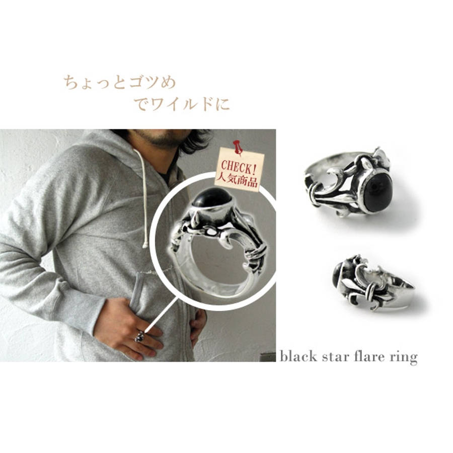 今大人気のブラックスター(中央の黒い石)をリリーフレアデザインのリングに大胆にセッティングしたアイテムです。