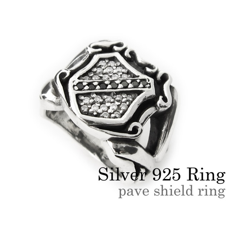 シールドモチーフのシルバーリング。前面のシールド部分には無数のクリアジルコニアが散りばめられておりそれを二分するかの様にナナメにブラックジルコニアをセットし高級感のある仕上がりに。さらにラージサイズで男らしさをプラスした贅沢なシルバーリングです。