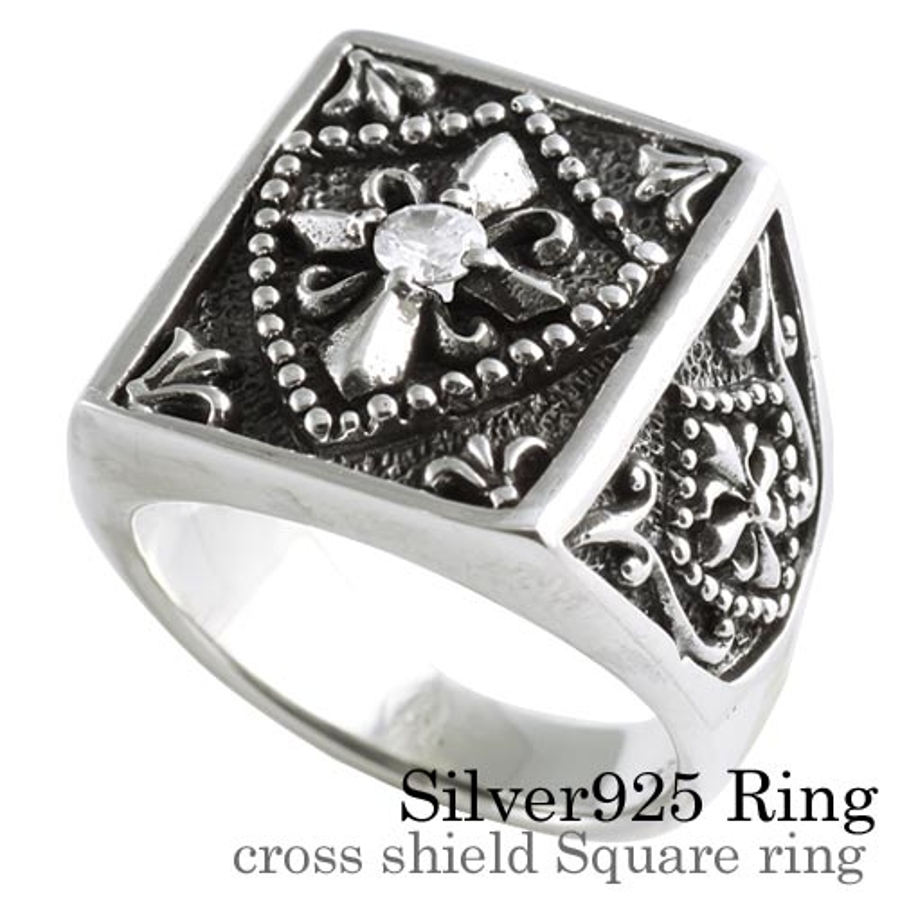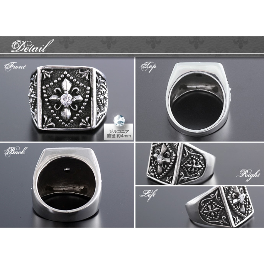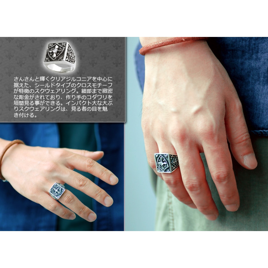 さんさんと輝くクリアジルコニアを中心に据えた、シールドタイプのクロスモチーフが特徴のスクウェアリング。細部まで緻密な彫金がされており、作り手のコダワリを垣間見る事ができる。インパクト大な大ぶりサイズなので、その形は見る者の目を魅き付ける。