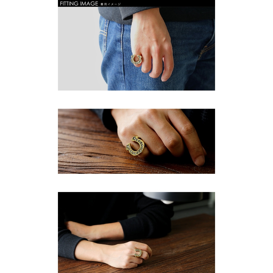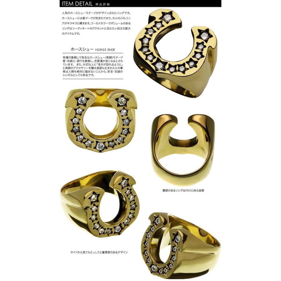 人気の馬蹄(ホースシュー)モチーフがデザインされたリングです。ホースシューには星マークが刻まれており、大小のジルコニアがキラキラと輝きます。ゴールドカラーでボリュームのあるリングはコーディネートのアクセントに加えたい目立ち度大のアイテムです。