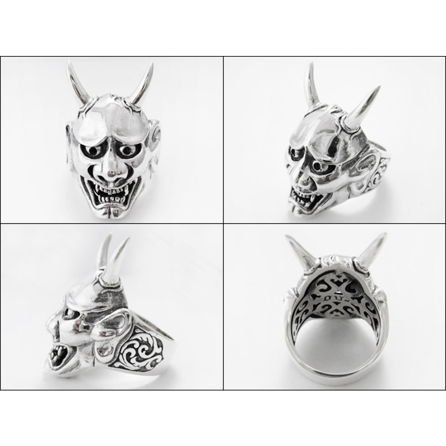 般若をモチーフにした和柄シルバーリング。般若とは能などでよく用いられる女面の一つで二本の角をもつ鬼女の面。憤怒・嫉妬・苦悩の情を表すとせれています。リング側面には唐草模様が彫金されており、和柄独特の雰囲気がうまく表現されています。サラッと和柄デザインのリングを身につけるのもおしゃれですね。