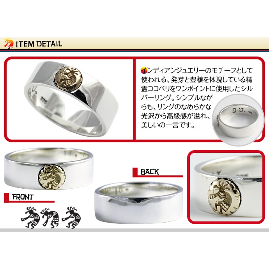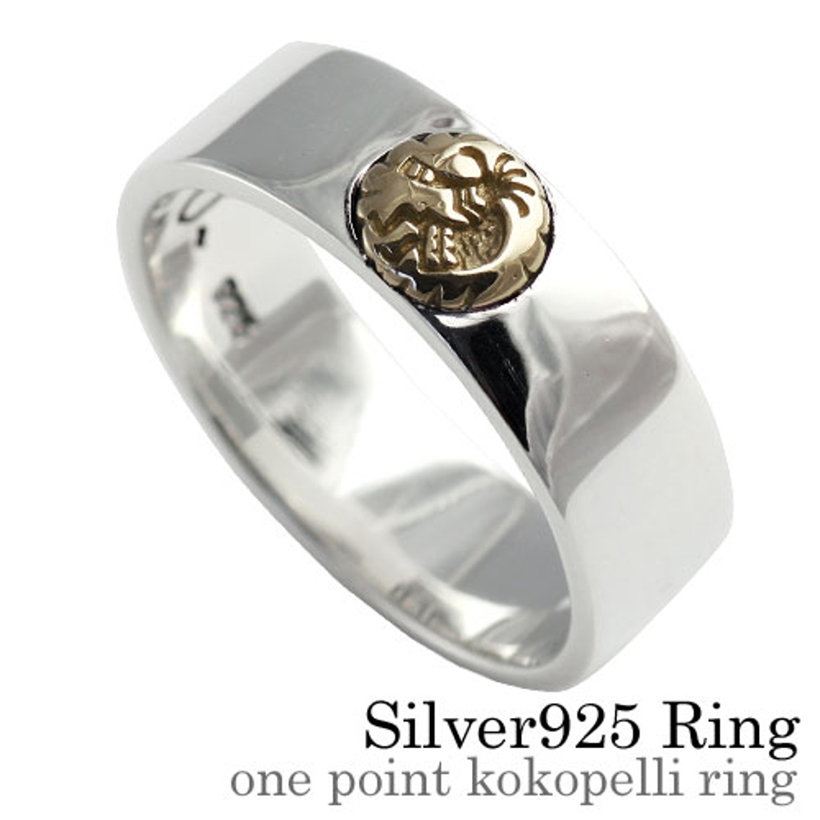 インディアンジュエリーのモチーフとして使われる、発芽と豊穣を体現している精霊ココペリをワンポイント(真鍮製)に使用したシルバーリング。シンプルながらも、リングのなめらかな光沢は高級感が溢れ、美しいの一言です。