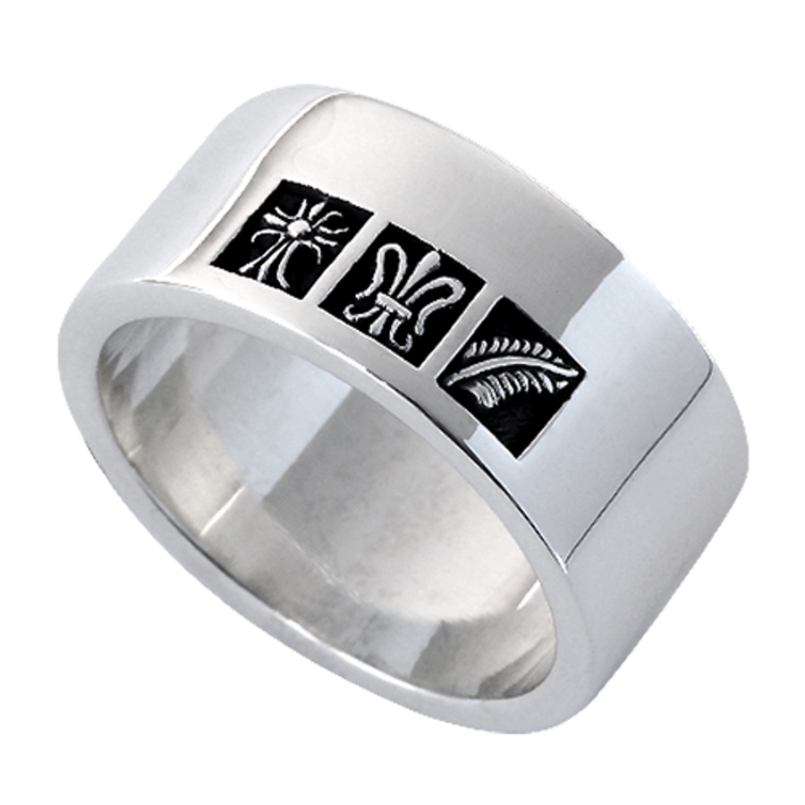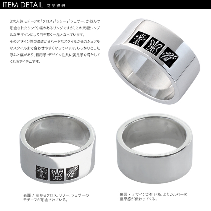 3大人気モチーフの「クロス」「リリー」「フェザー」が並んで彫金されたリング。幅のあるリングですが、この究極シンプルなデザインにより目を惹く一品となっています。そのデザイン性の高さからハードなスタイルからカジュアルなスタイルまで合わせやすくなっています。リング幅は10mm、厚みは2mmとなっており、着用感、デザイン性、共に満足感を満たしてくれるアイテムです。