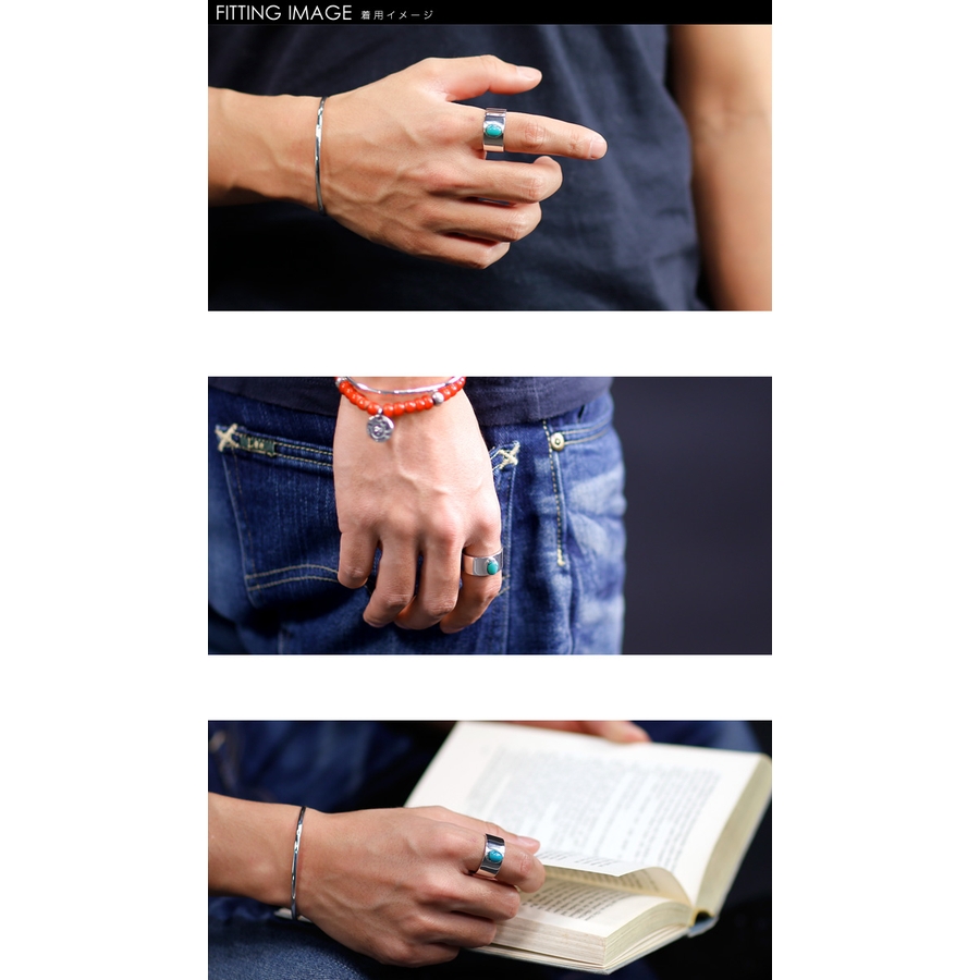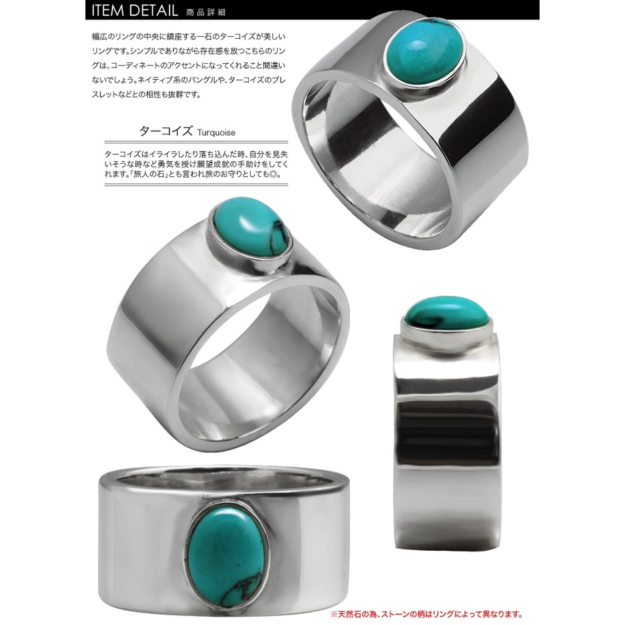 幅広のリングの中央に鎮座する一石のターコイズが美しいリングです。シンプルでありながら存在感を放つこちらのリングは、コーディネートのアクセントになってくれること間違いないでしょう。ネイティブ系のバングルや、ターコイズのブレスレットなどとの相性も抜群です。