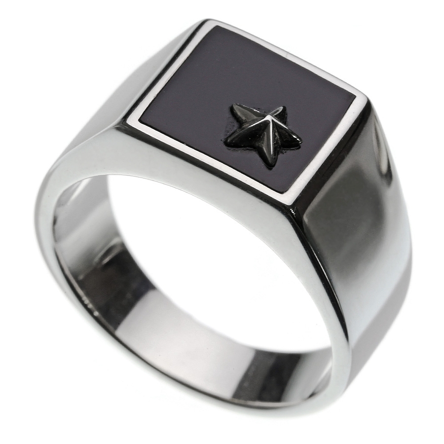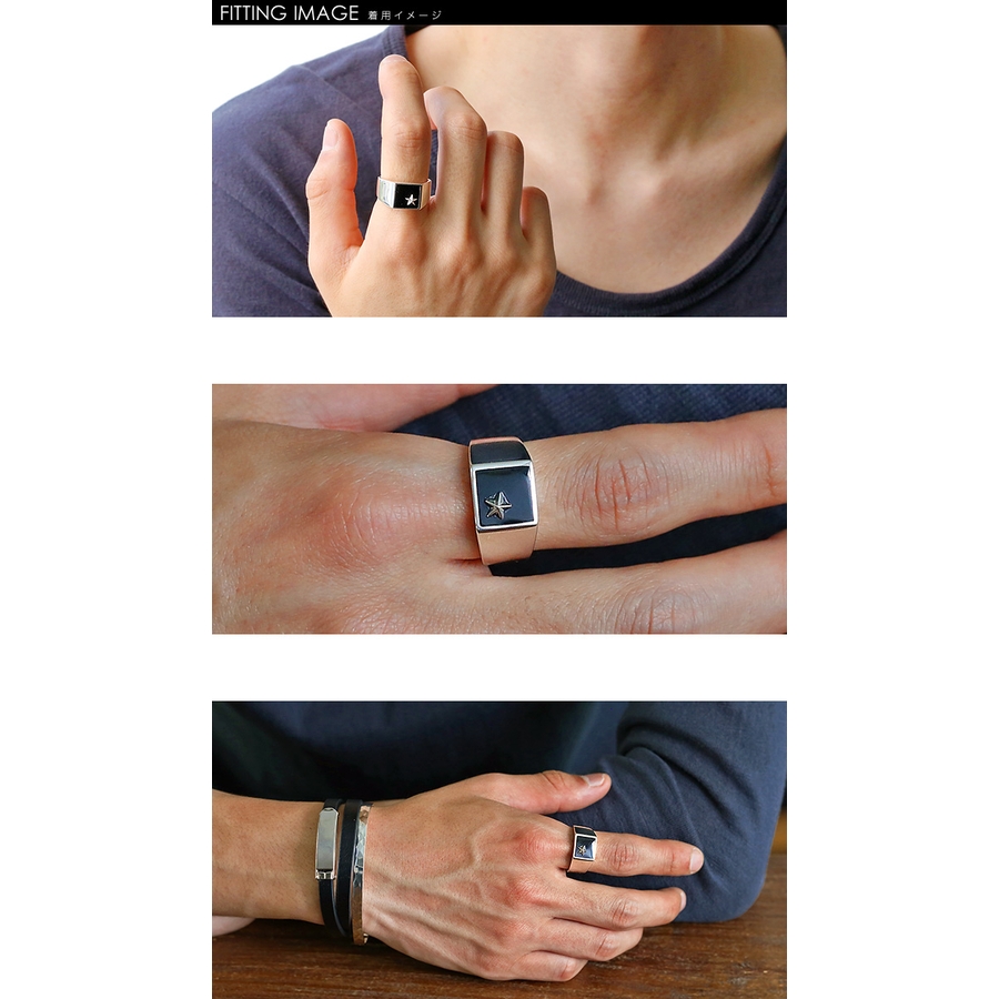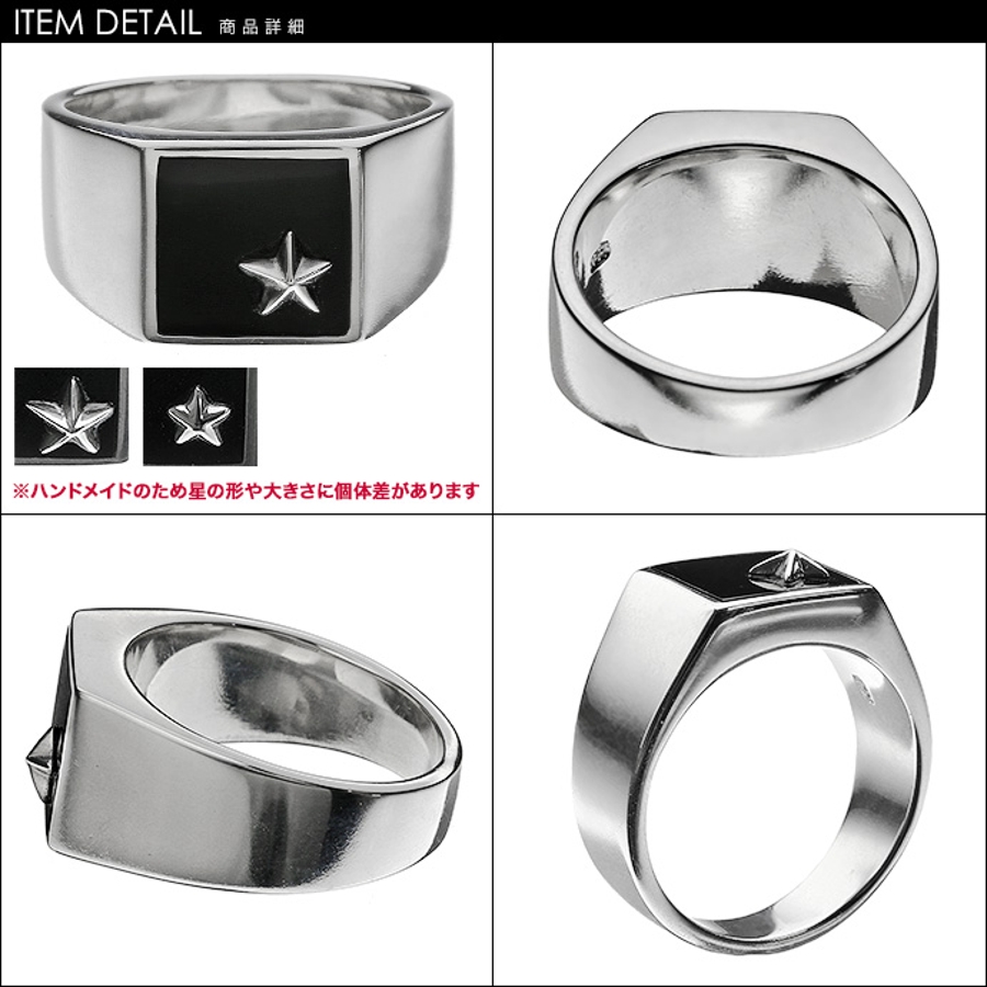 トップに埋め込まれた黒色のレジンの上にシルバーの星が輝く、印象的なデザインのリング。シルバーの輝きとつややかなな黒色レジンのコントラストが楽しめます。ハンドメイドで1つ1つ表情の異なる星がアクセントなシンプルアクセです。