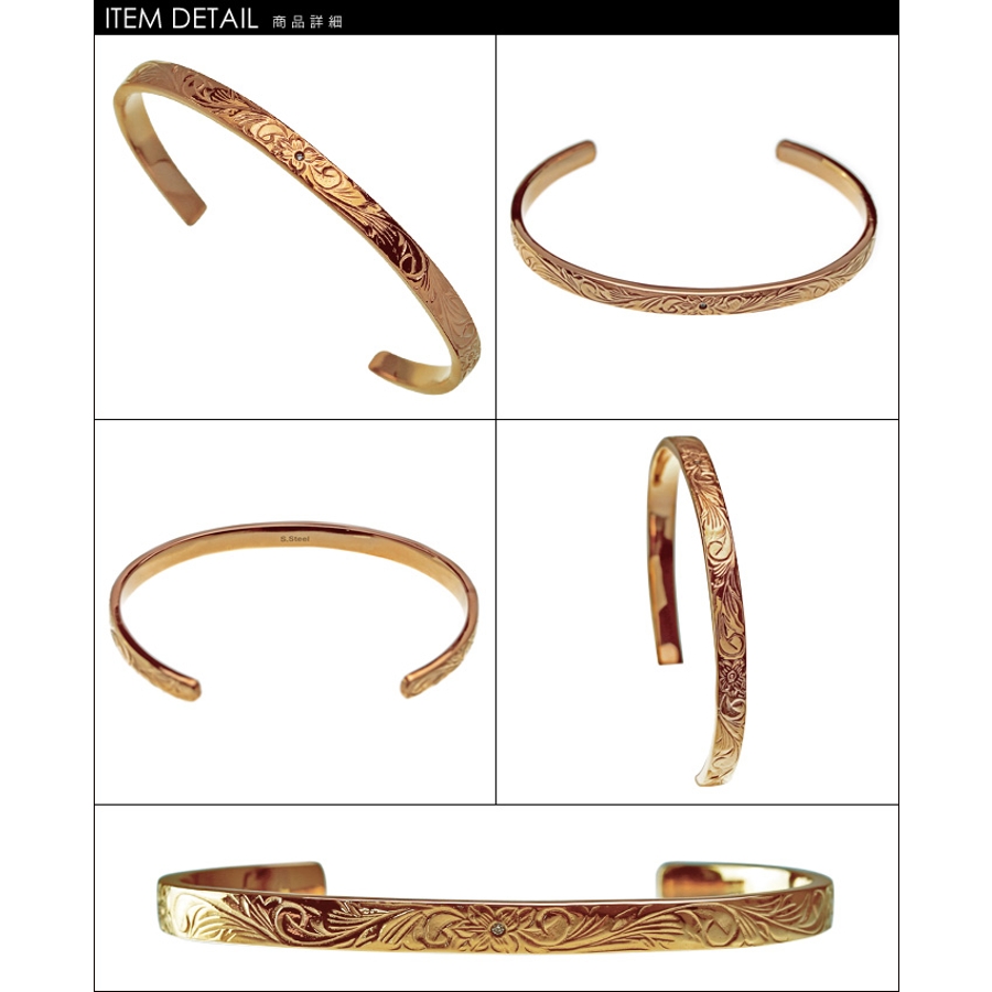 スッキリとした細身のバングルに繊細なハイビスカスの模様を彫金した正統派ハワイアンジュエリー。バングル中央にはジルコニアが埋め込まれており、一層上品な雰囲気を醸し出します。細身のデザインなので普段使いのアクセントにピッタリ!素材には、ダメージに強く金属アレルギーを起こしにくいステンレススチールを使用。またハイビスカスは、輝かしい未来や新しい恋を望む人にチャンスを呼び込むと言われています。