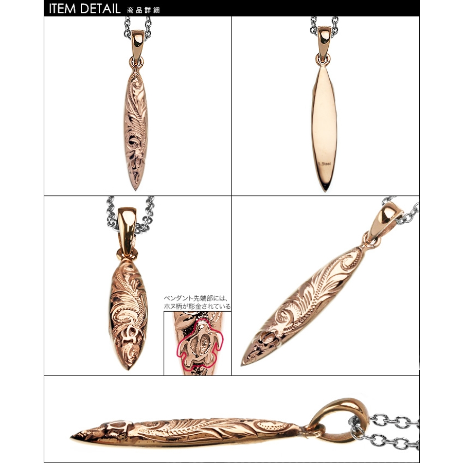 細やかで美しい装飾が魅力のハワイアンテイストのアイテム。サーフボートの様なフォルムがすっきりとした印象を与えます。また先端部には"ホヌ柄"が彫金されいます。ホヌ柄は海亀をモチーフとしており、ハワイでは幸運を運ぶ海の守り神という意味が込められています。コーデにさりげなく華を添えるペンダントはペアでの着用もオススメです。