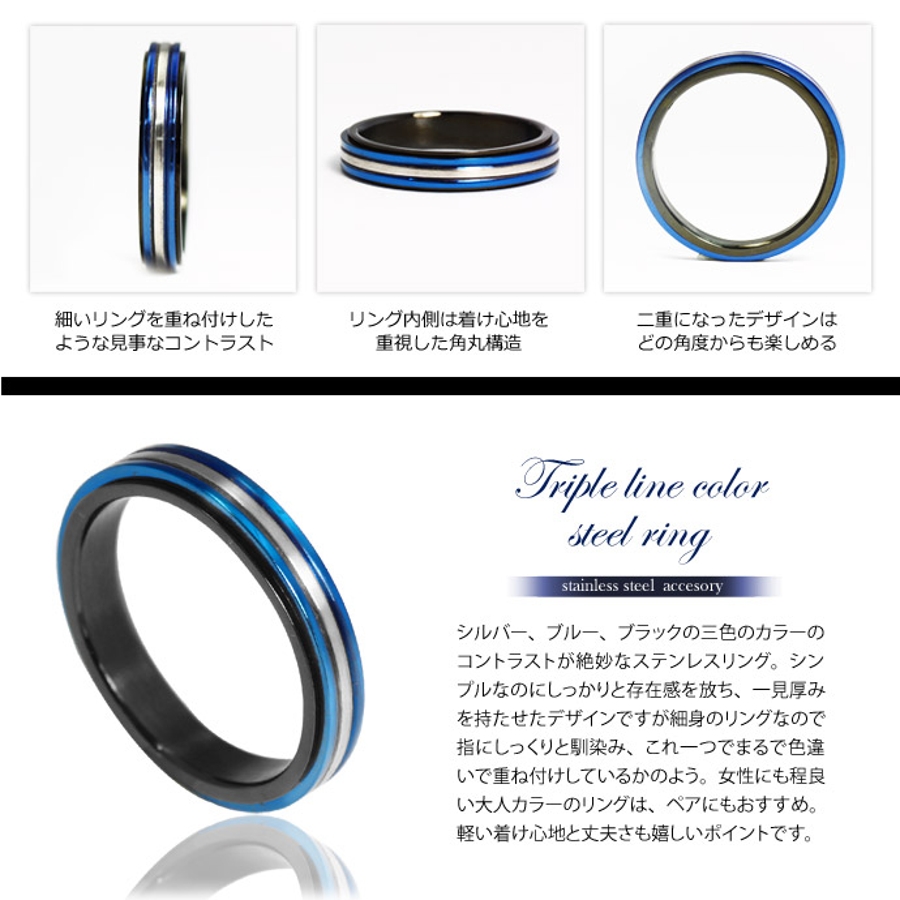 シルバー、ブルー、ブラックの三色のカラーのコントラストが絶妙なステンレスリング。シンプルなのにしっかりと存在感を放ち、一見厚みを持たせたデザインですが細身のリングなので指にしっくりと馴染み、これ一つでまるで色違いで重ね付けしているかのよう。女性にも程良い大人カラーのリングは、ペアにもおすすめ。軽い着け心地と丈夫さも嬉しいポイントです。