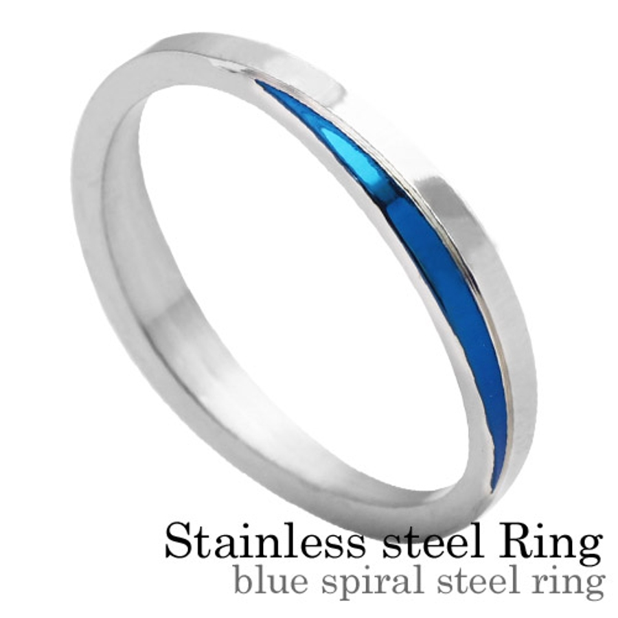 まるで細身の2連リングをしているような、青と銀の美しい螺旋を描いたデザイン。シルバーのラインからチラリと光るブルーラインが鮮やかで魅力的。キズ・汚れ・変色に強く、アレルギーの方も安心の素材ステンレスを使用しています。永遠を表すスパイラルモチーフでサイズも豊富だから、ペアリングにもオススメです。