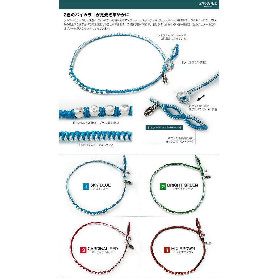 シルバーカラーのビーズがポイントになった編み込みアンクレット。スポーティなビビッドカラーが爽やかで、バイカラーになっているので上下を返すだけで印象を変えることができます。二段階調節が可能で、着けやすく外れにくい留め具部分に光るシュメールのロゴプレートがアクセントになっています。