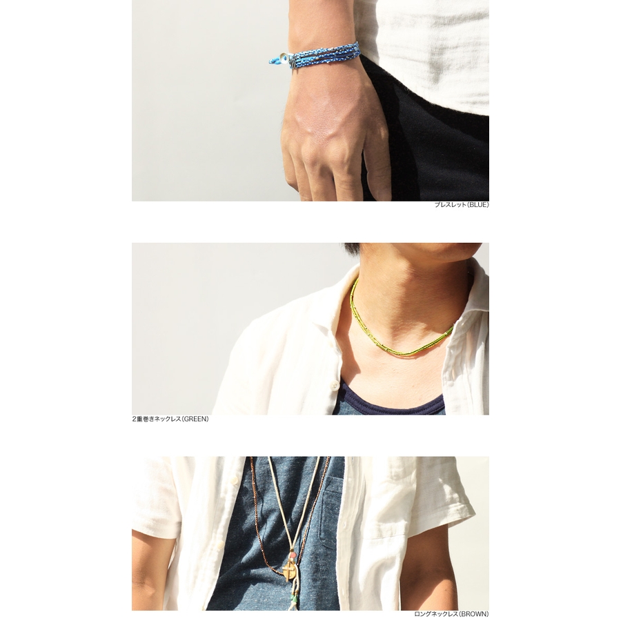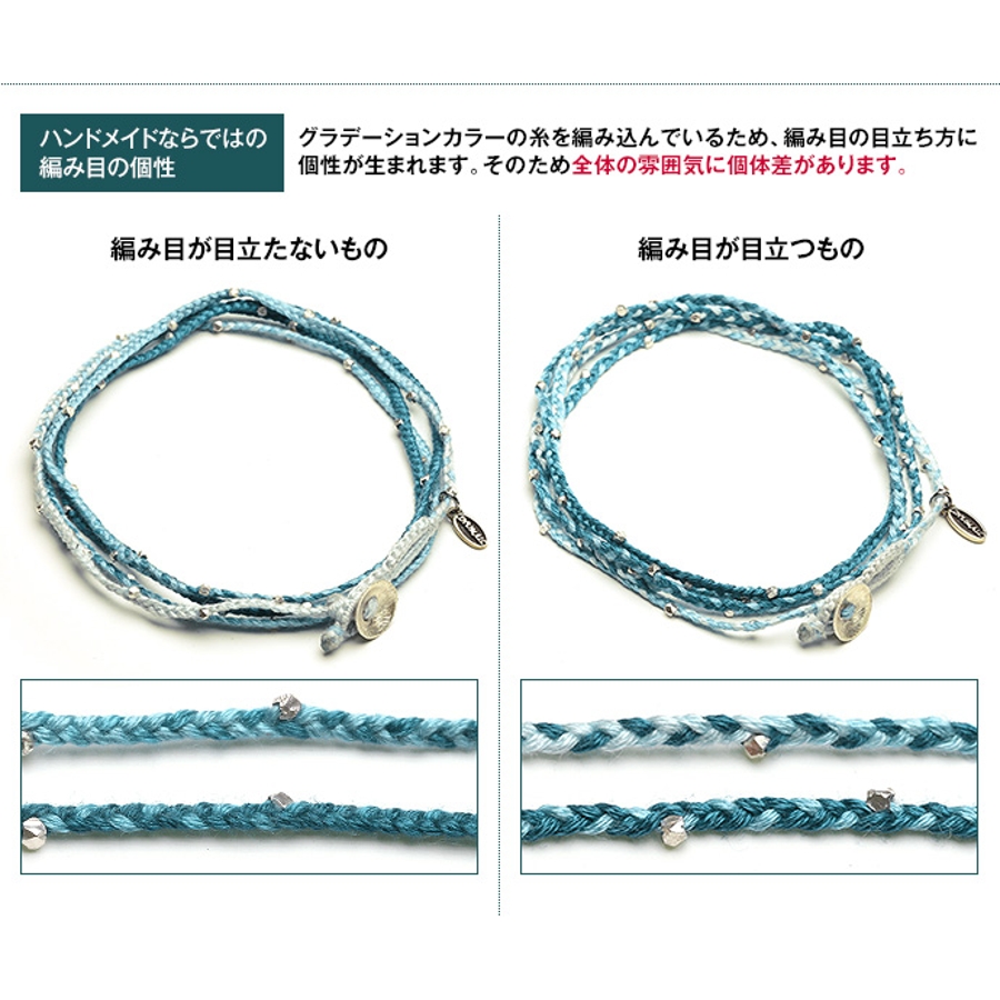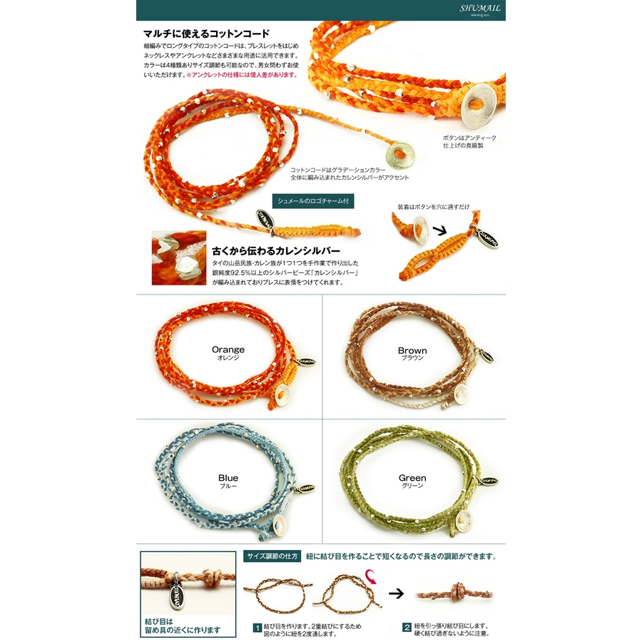 細編みでロングタイプのコットンコードは、ブレスレットをはじめネックレスやアンクレットなどさまざまな用途に活用できます。カラーは4種類ありサイズ調節も可能なので、男女問わずお使いいただけます。