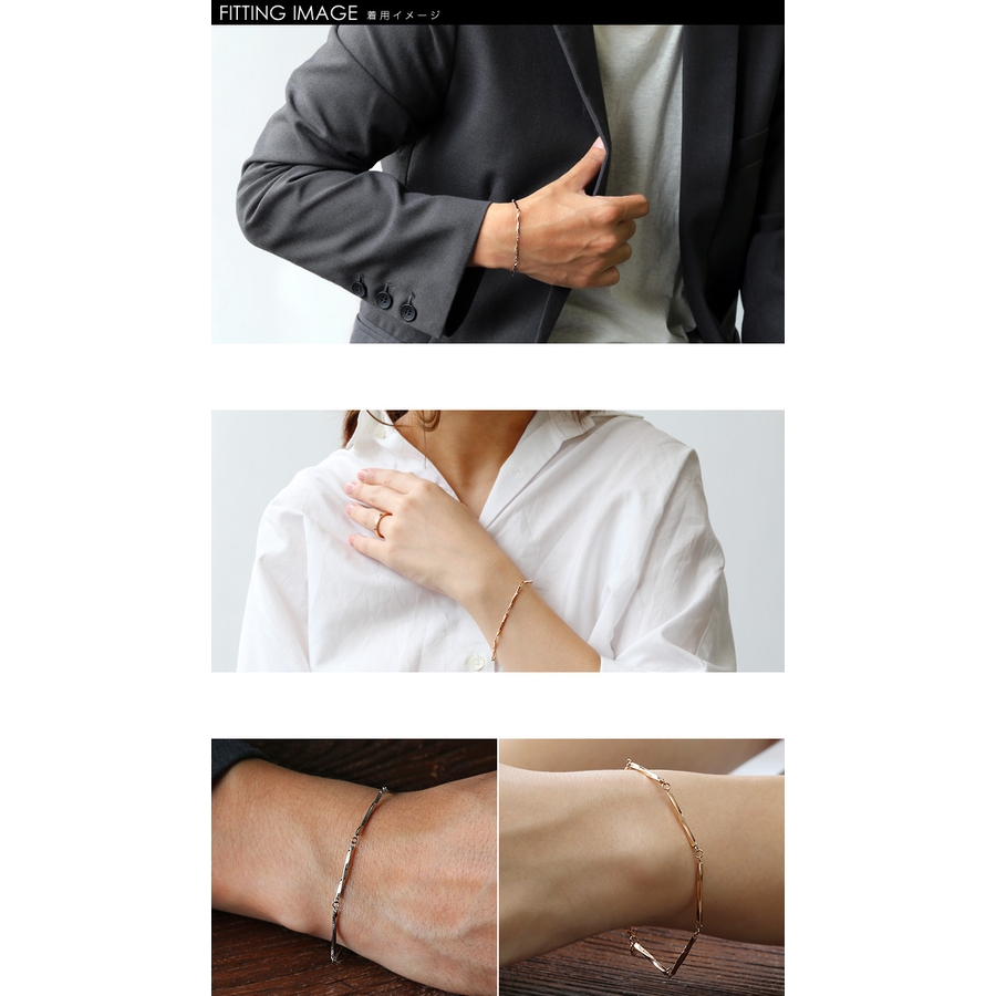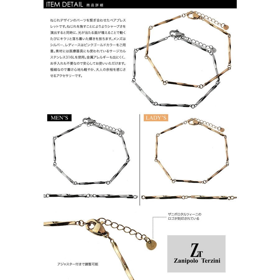 ねじれデザインのパーツを繋ぎ合わせたペアブレスレットです。ねじれを施すことによりよりシャープさを演出すると同時に、光が当たる面が増えることで動くたびにキラリと落ち着いた輝きを放ちます。メンズはシルバー、レディースはピンクゴールドカラーをご用意。素材には医療器具にも使われているサージカルステンレス316Lを使用。金属アレルギーも出にくく、お手入れも不要なので安心してお使いいただけます。極細なので着け心地も軽やか、大人の余裕を感じさせるアクセサリーです。