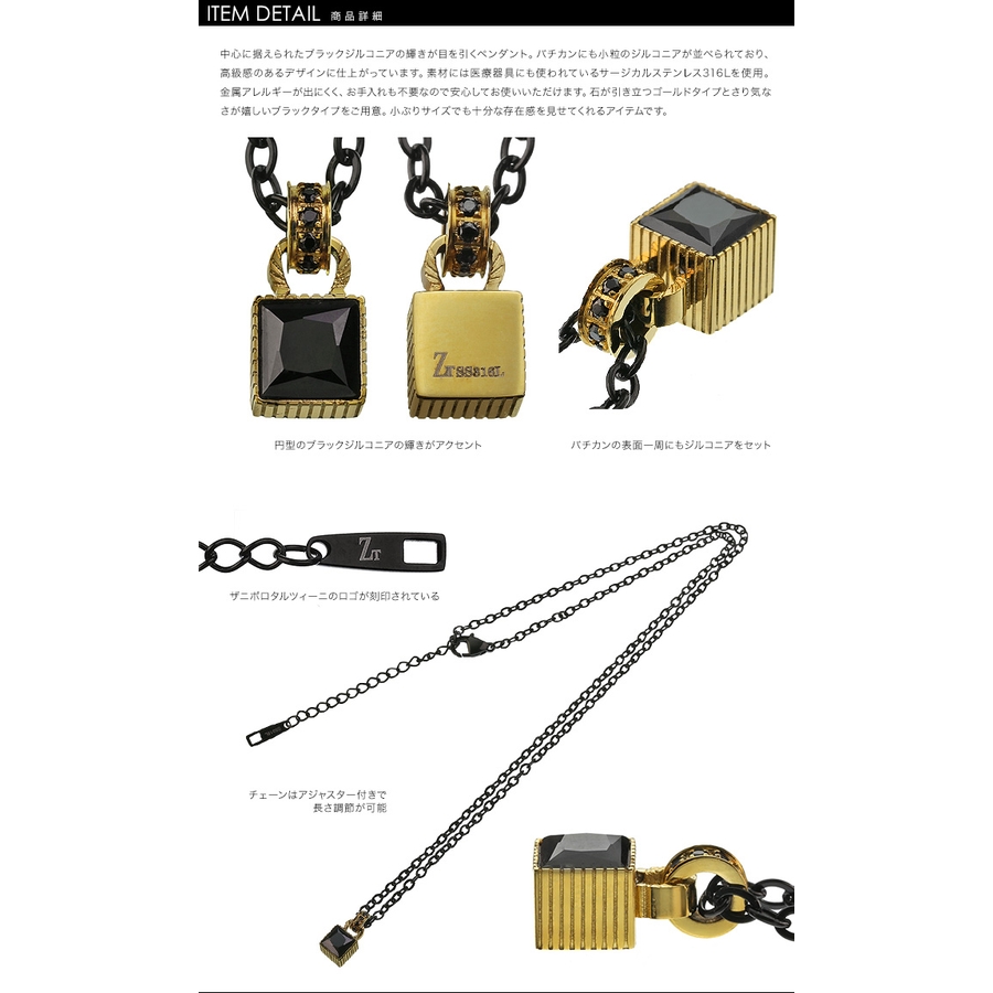 中心に据えられたブラックジルコニアの輝きが目を引くペンダント。バチカンにも小粒のジルコニアが並べられており、高級感のあるデザインに仕上がっています。素材には医療器具にも使われているサージカルステンレス316Lを使用。金属アレルギーが出にくく、お手入れも不要なので安心してお使いいただけます。石が引き立つゴールドタイプとさり気なさが嬉しいブラックタイプをご用意。小ぶりサイズでも十分な存在感を見せてくれるアイテムです。