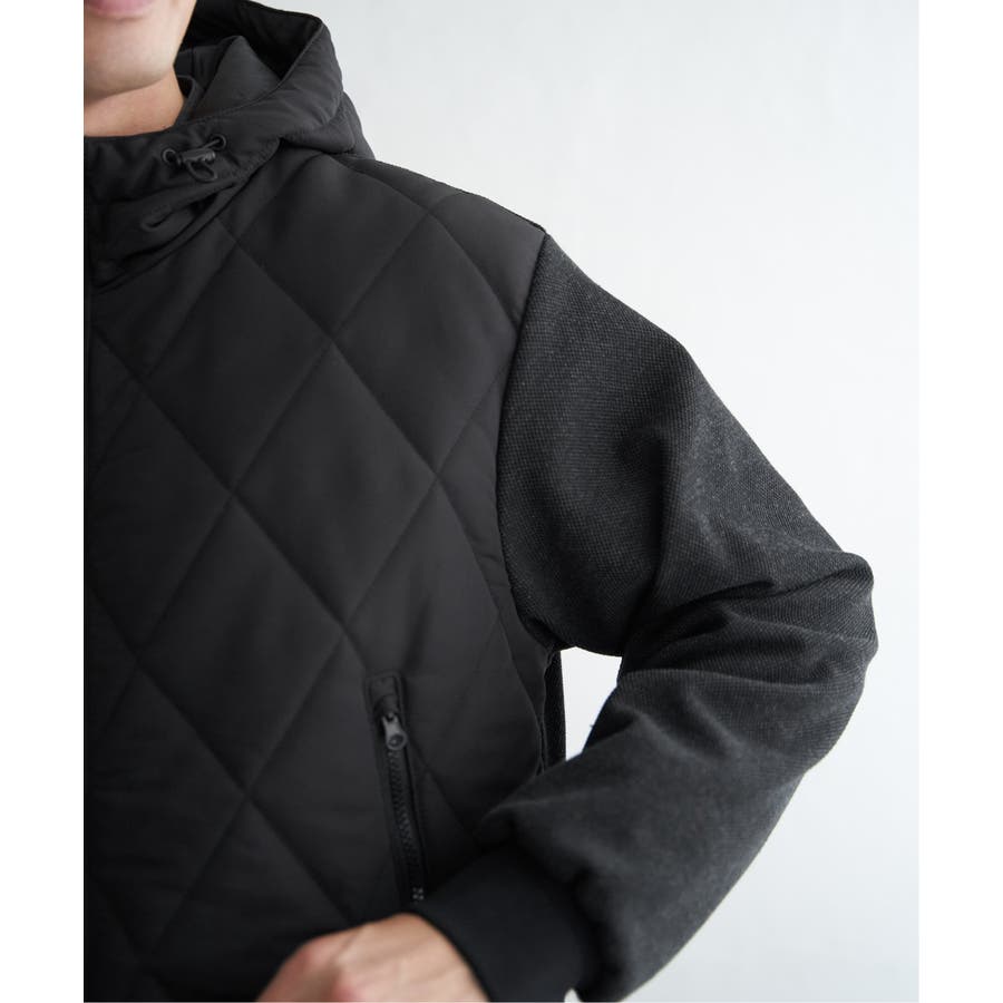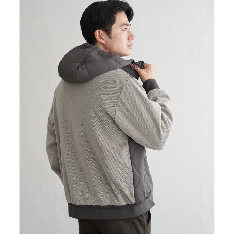 前身頃は布帛、後ろ身頃と袖にジャージ素材を使用した異素材コンビパーカ。