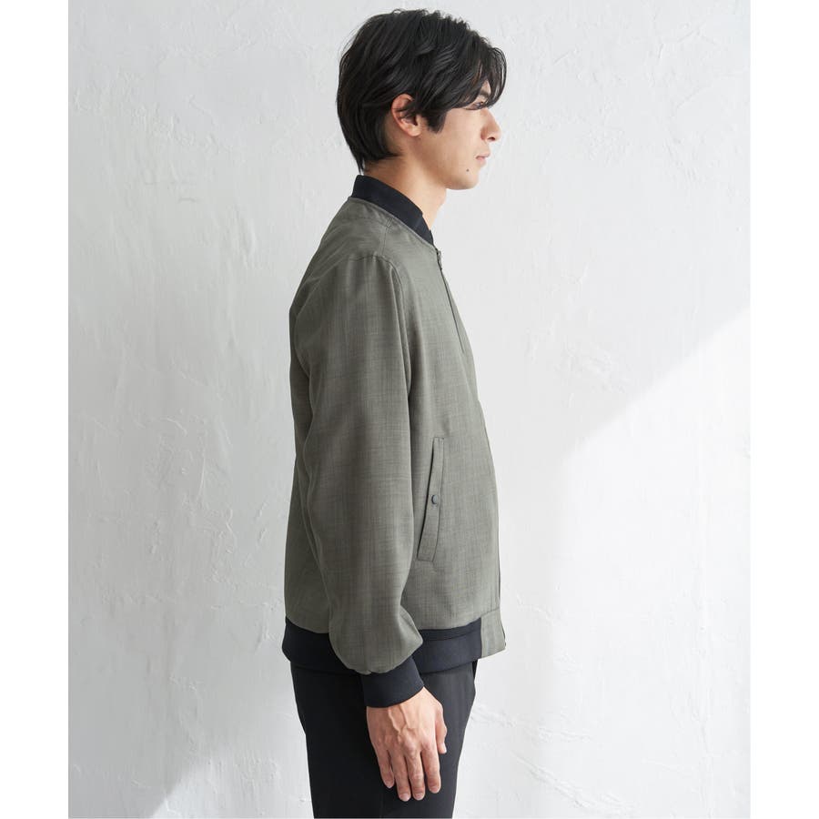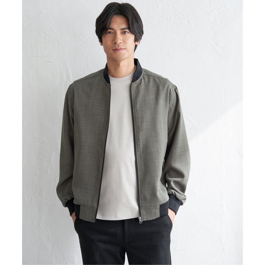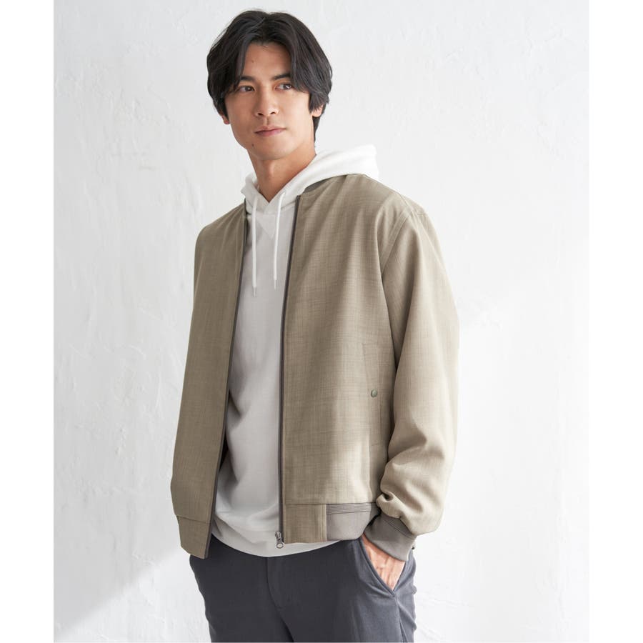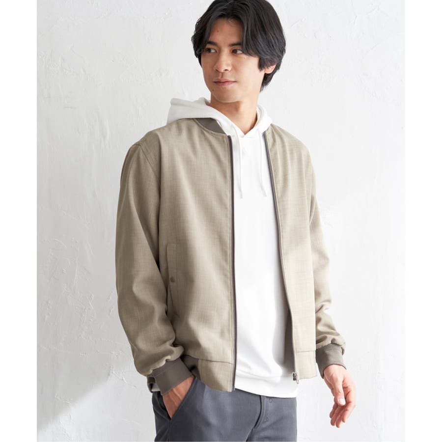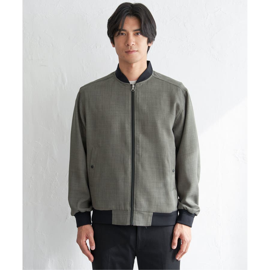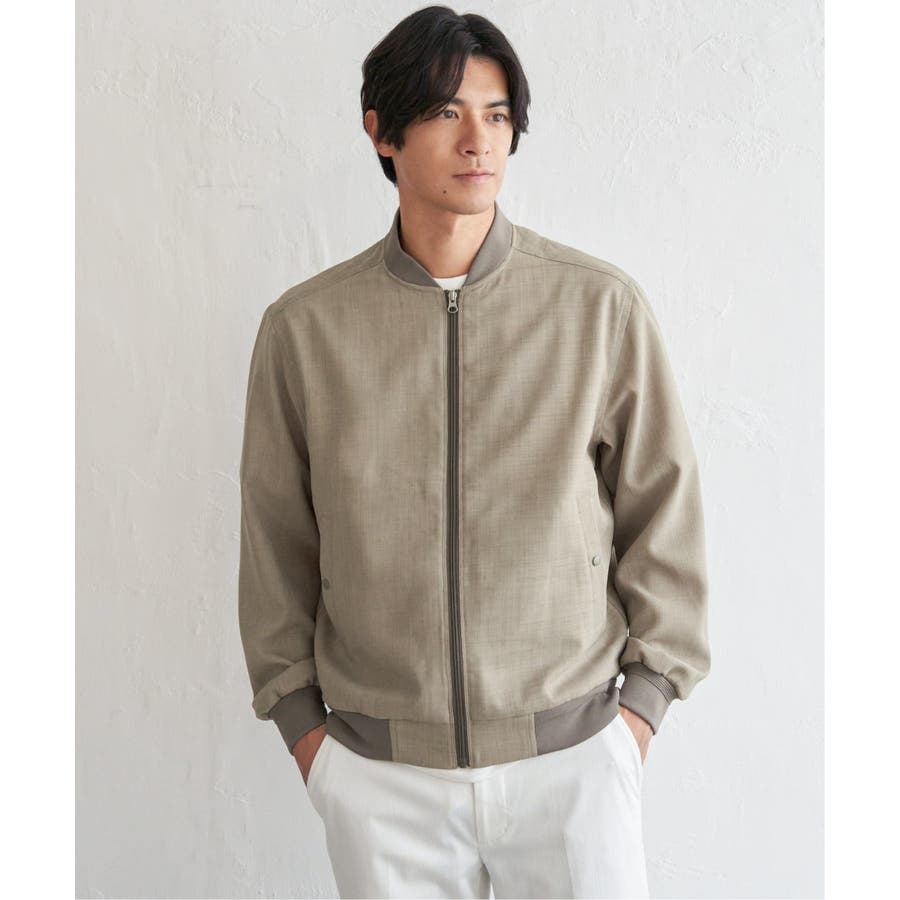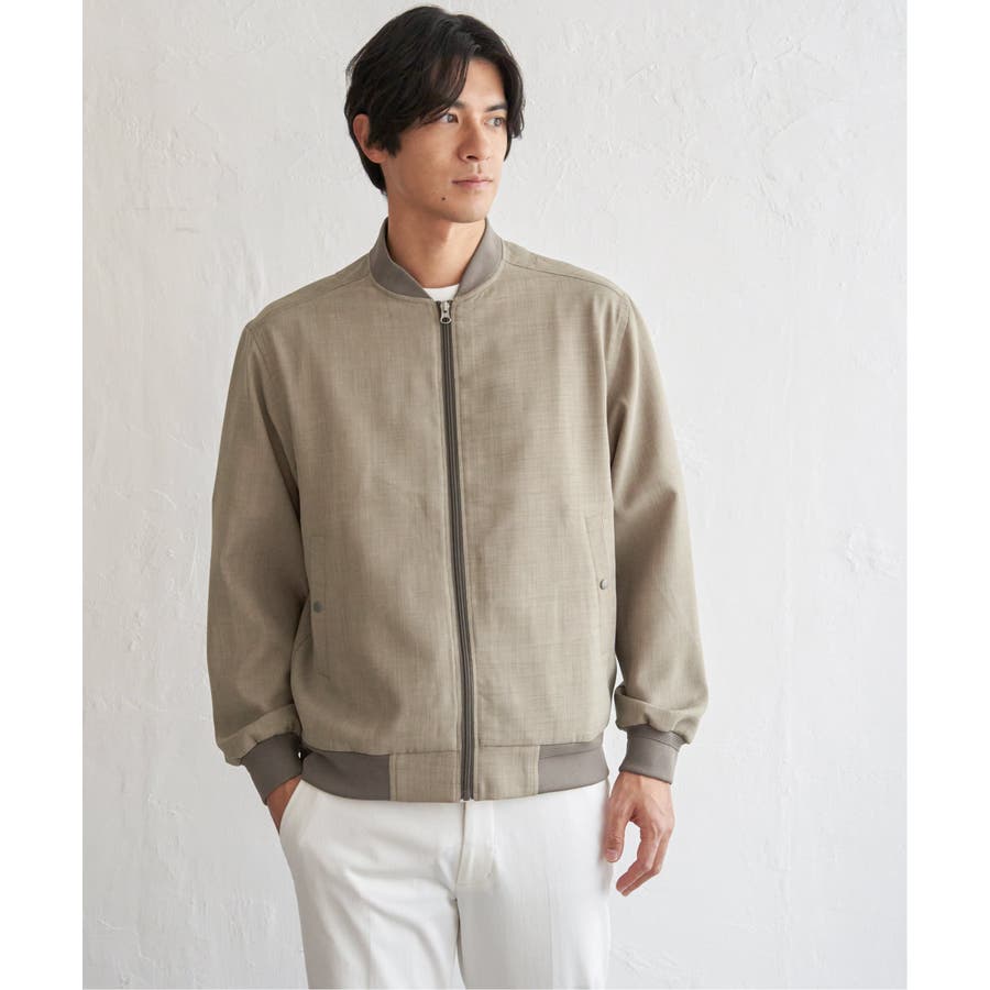麻のような表情を持つ、清涼感のあるポリエステル素材を使用したリネンライクブルゾン。