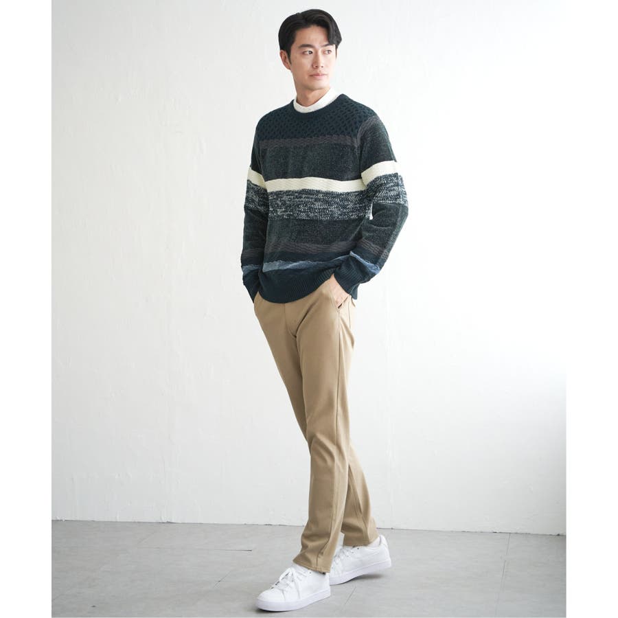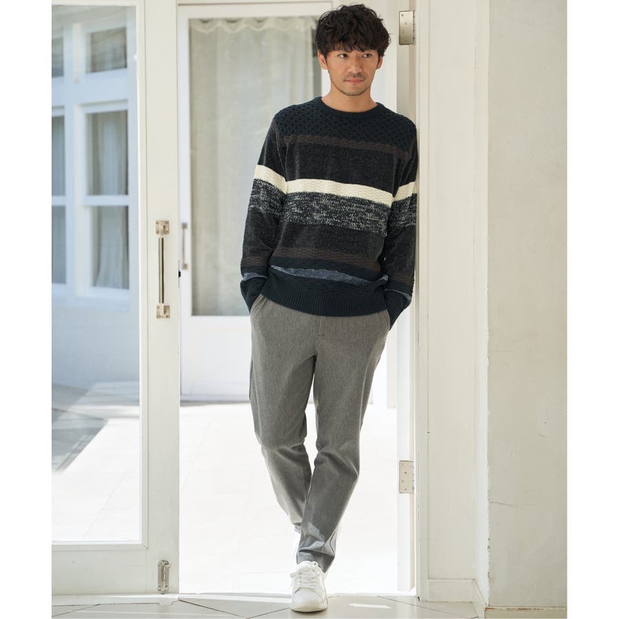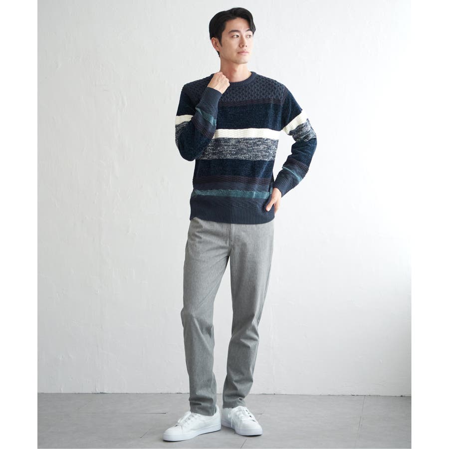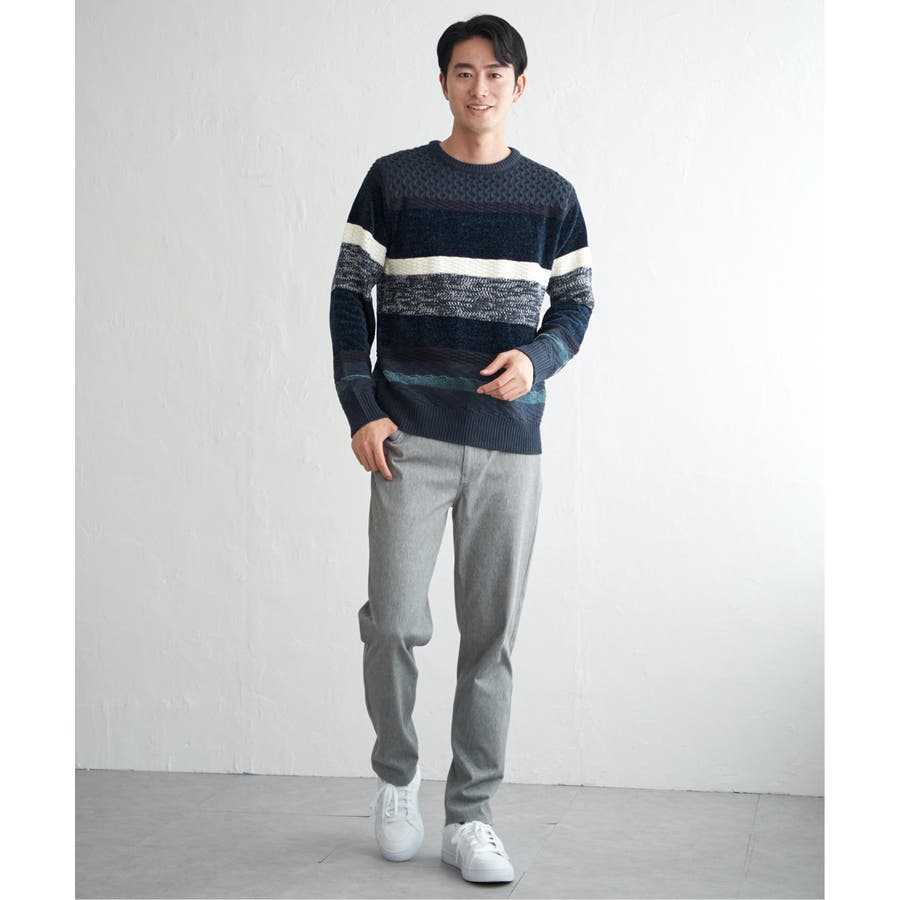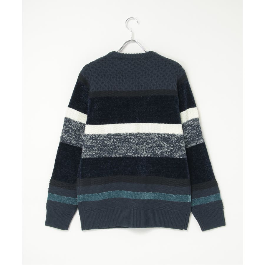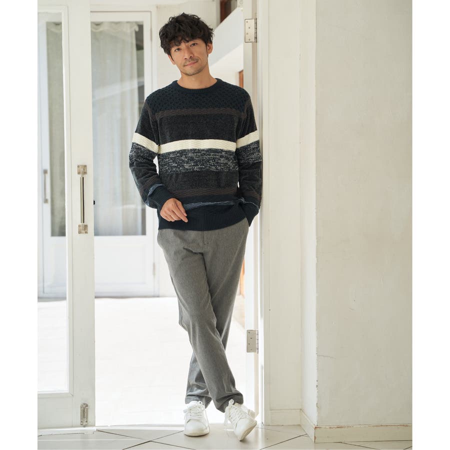 2つの糸を組み合わせた編地変化のボーダーニット。