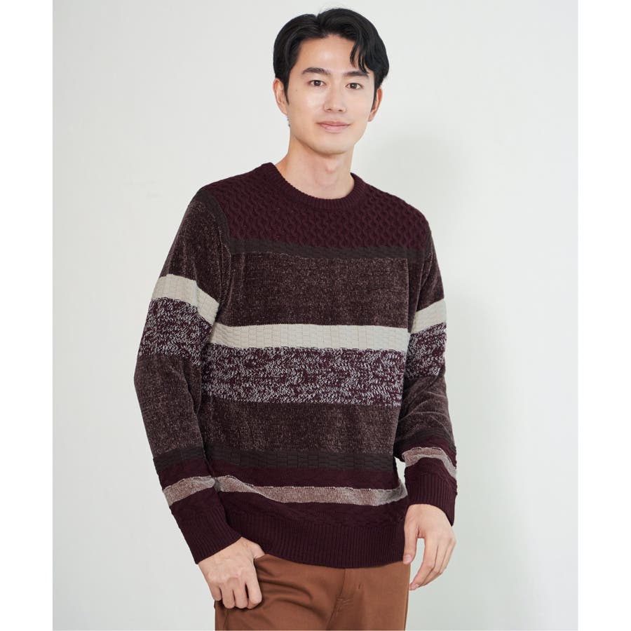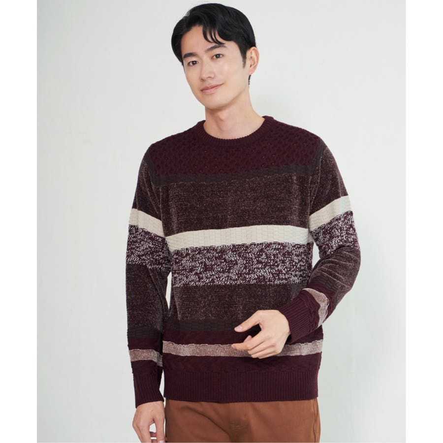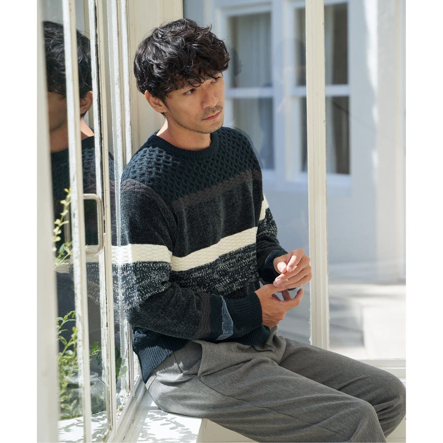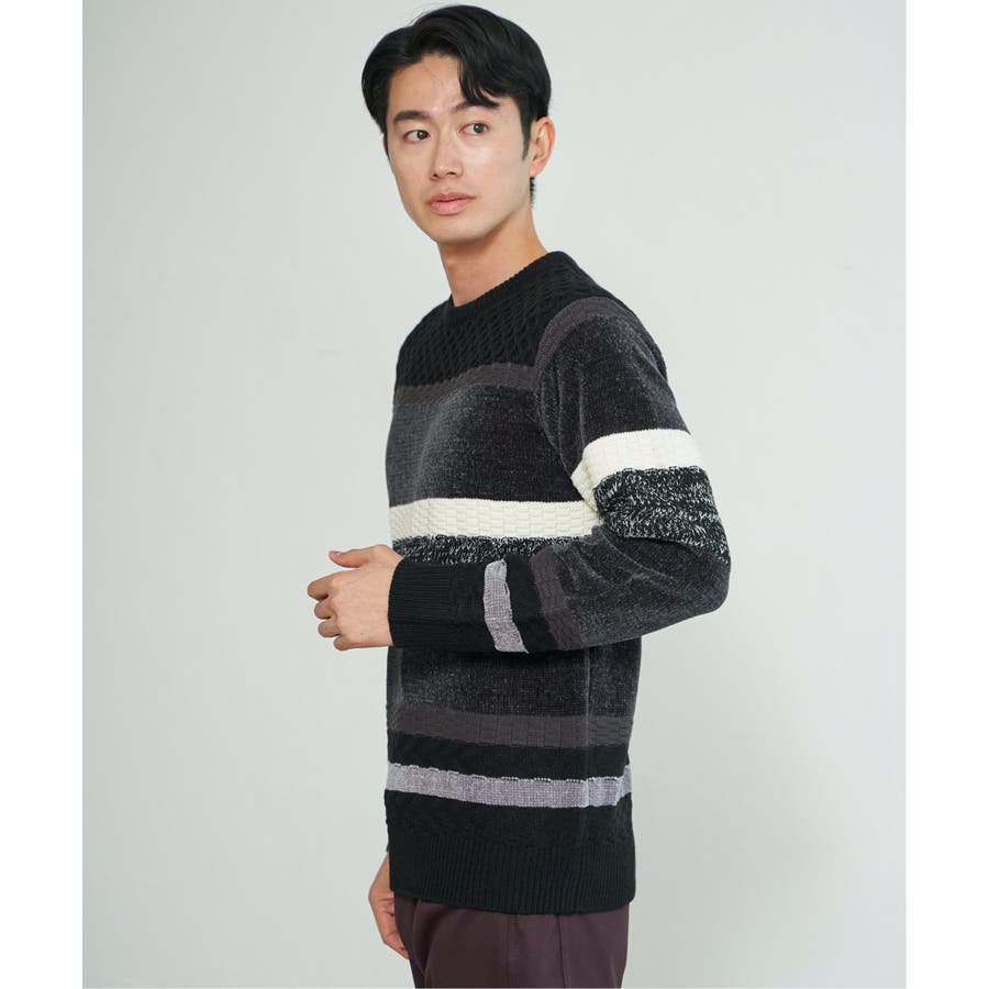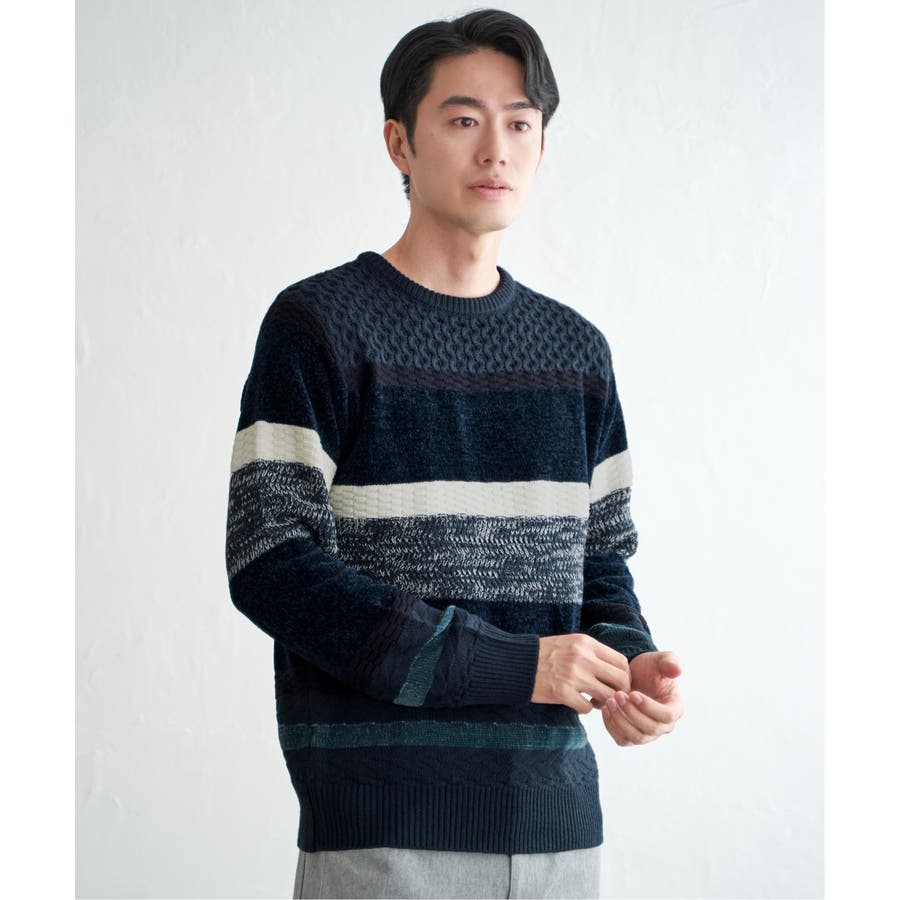 発色の良いモール糸と、汎用性のあるアクリル糸を配色使いしたボーダーニット。