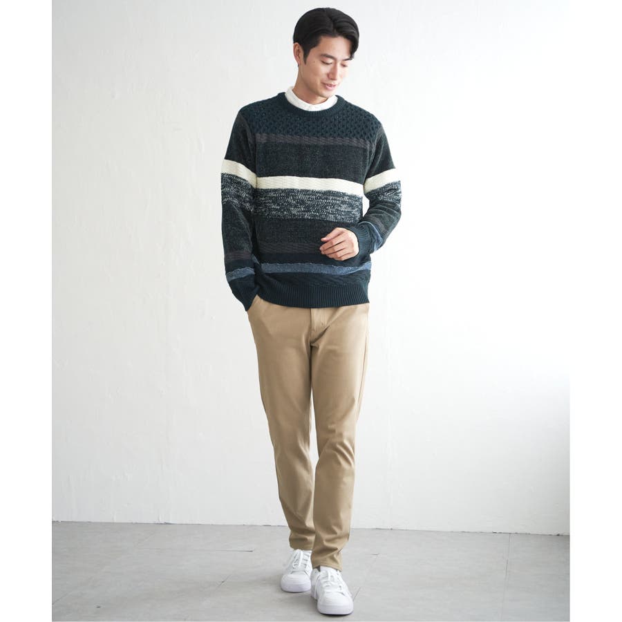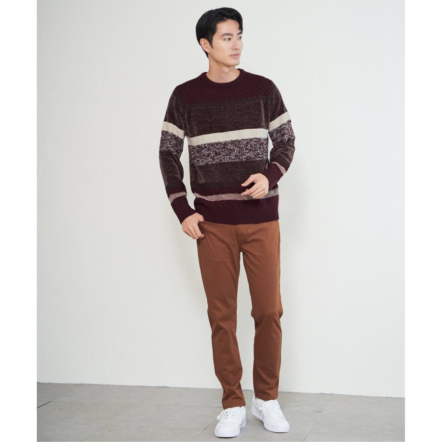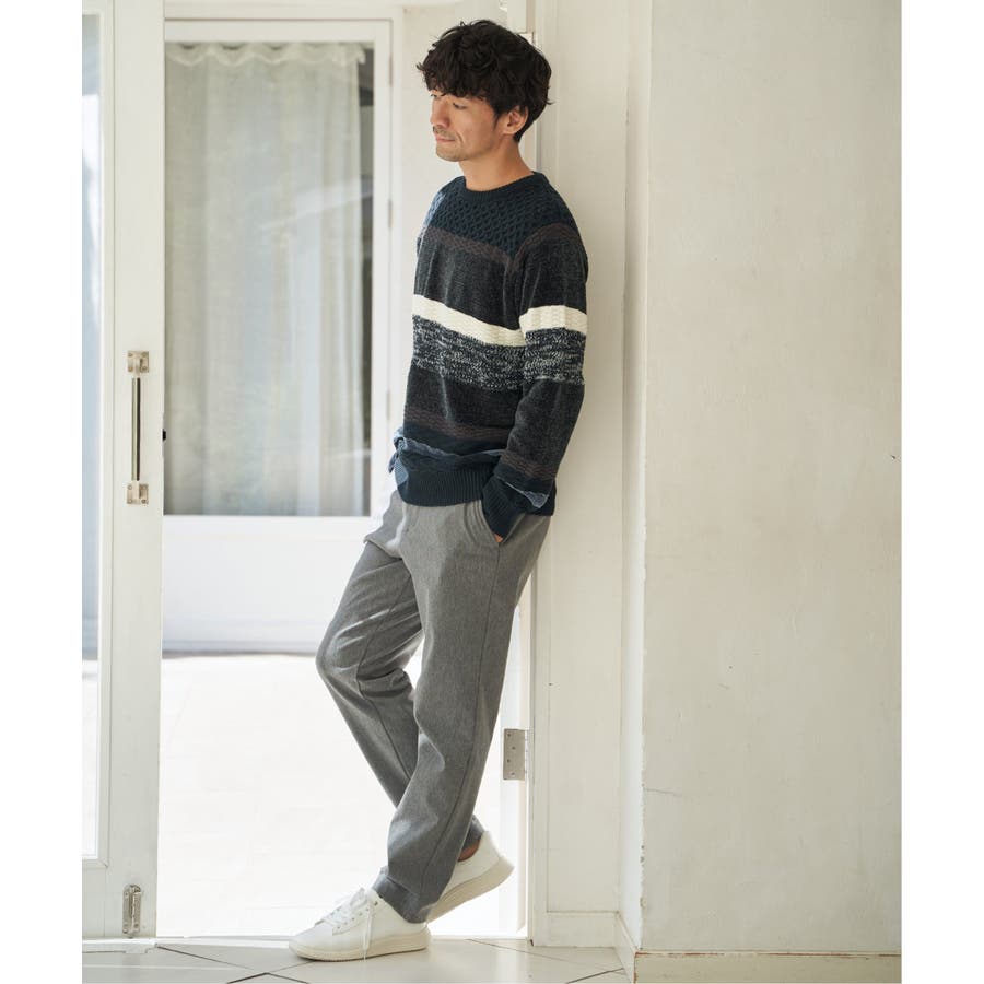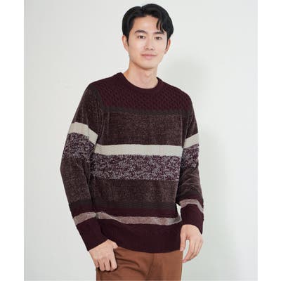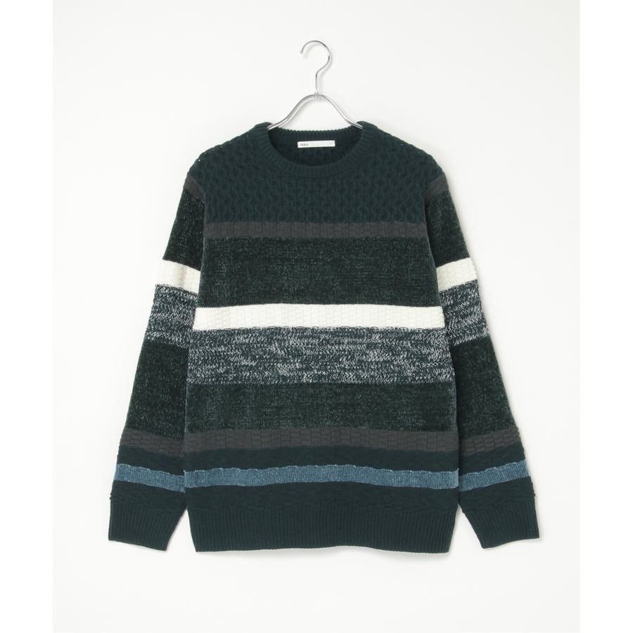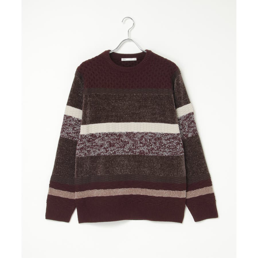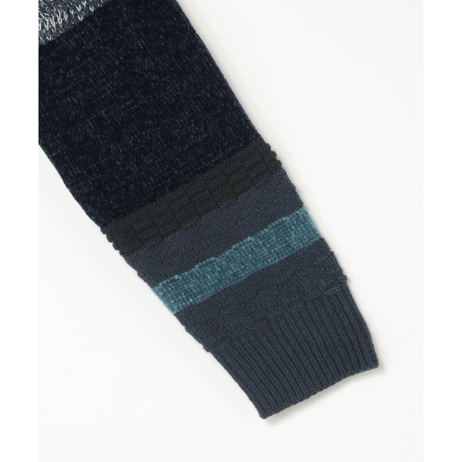 発色の良いモール糸と、汎用性のあるアクリル糸を配色使いしたボーダーニット。