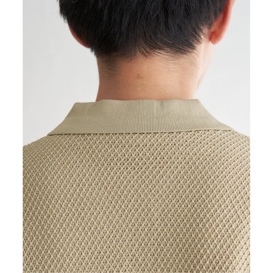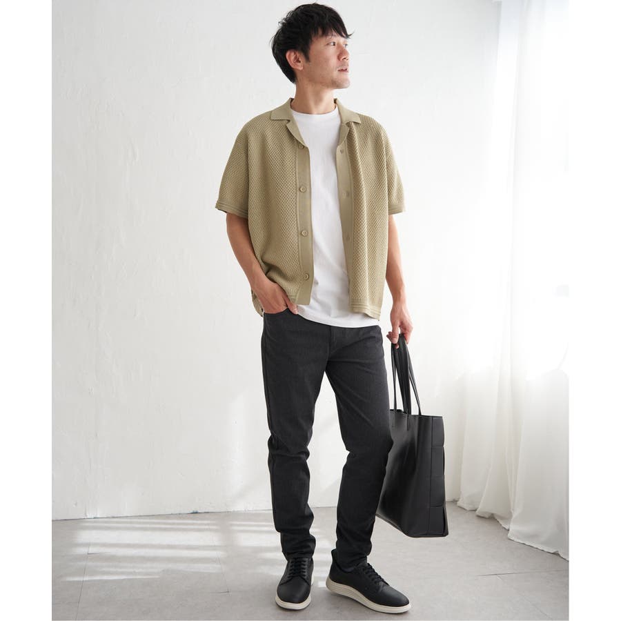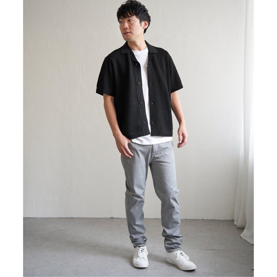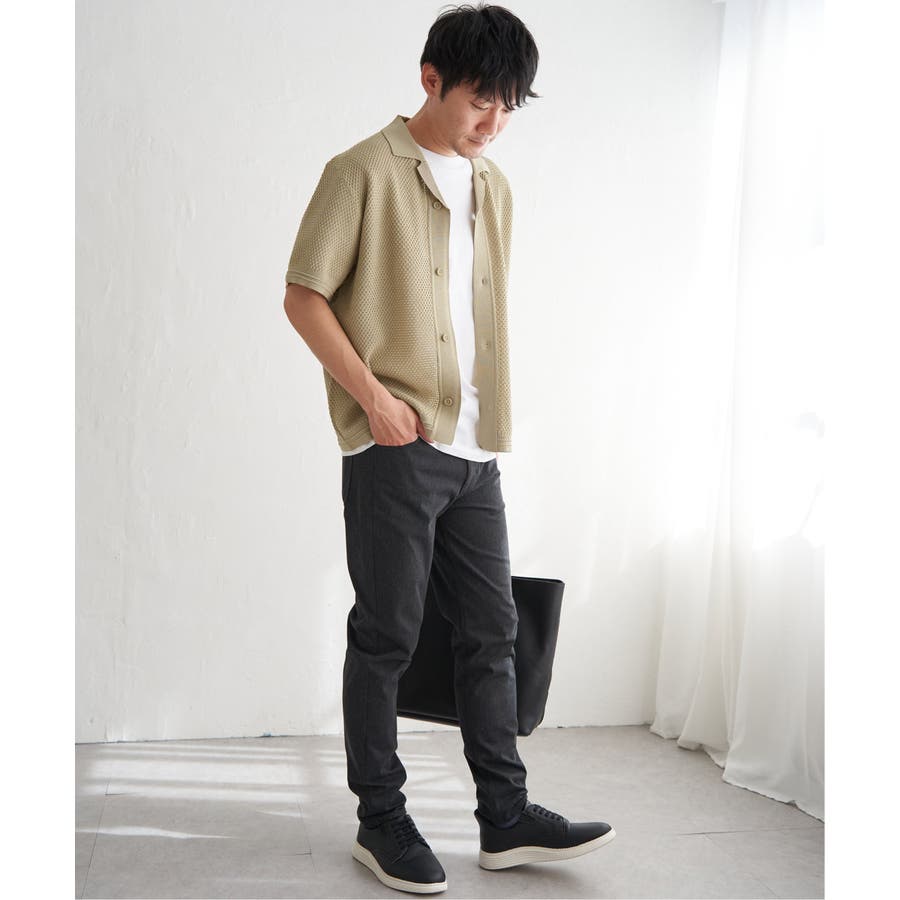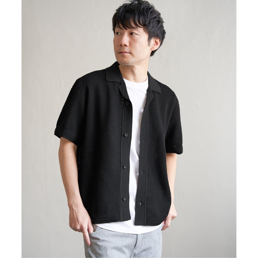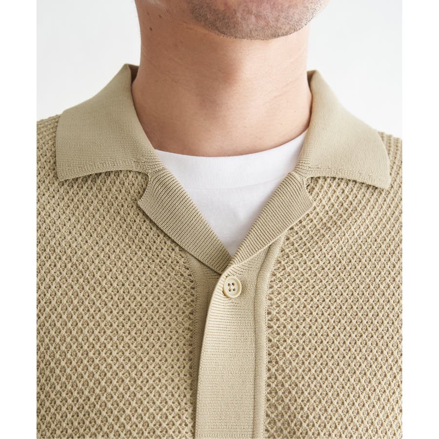 ニットは表情豊かな編地で、オープンカラーが独特の雰囲気を醸し出します。