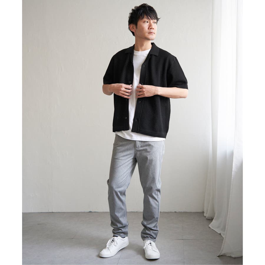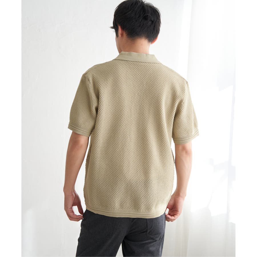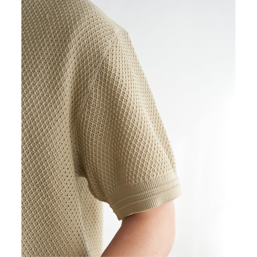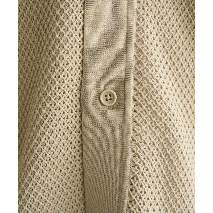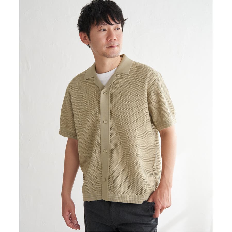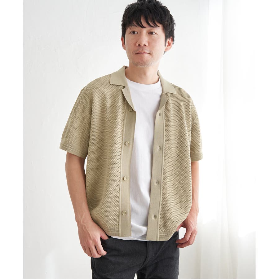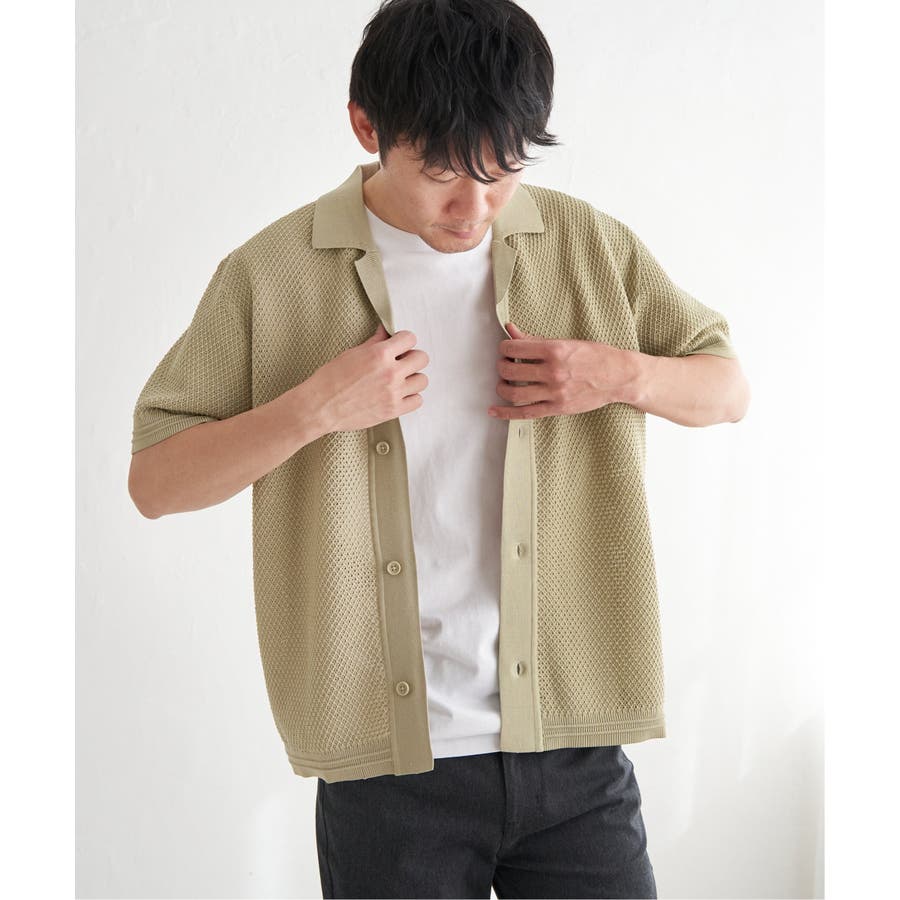 ニットは表情豊かな編地で、オープンカラーが独特の雰囲気を醸し出します。