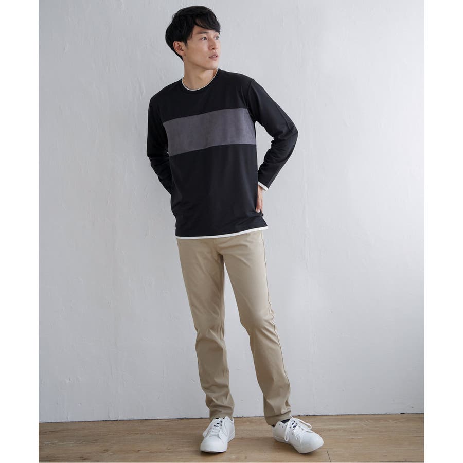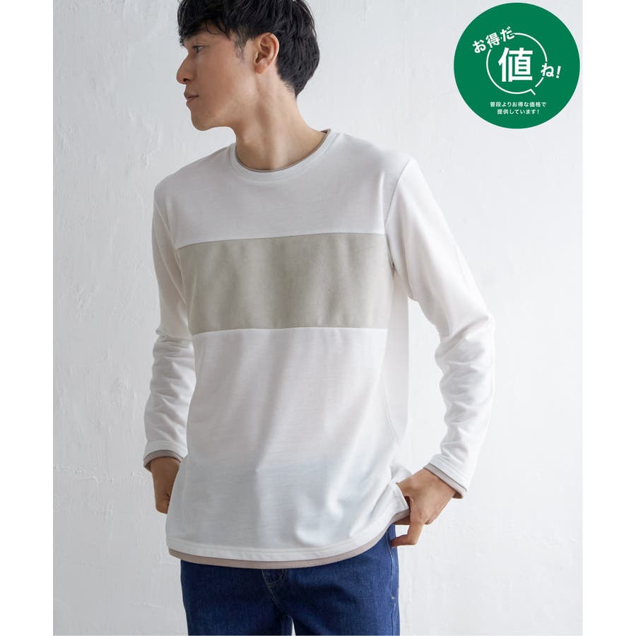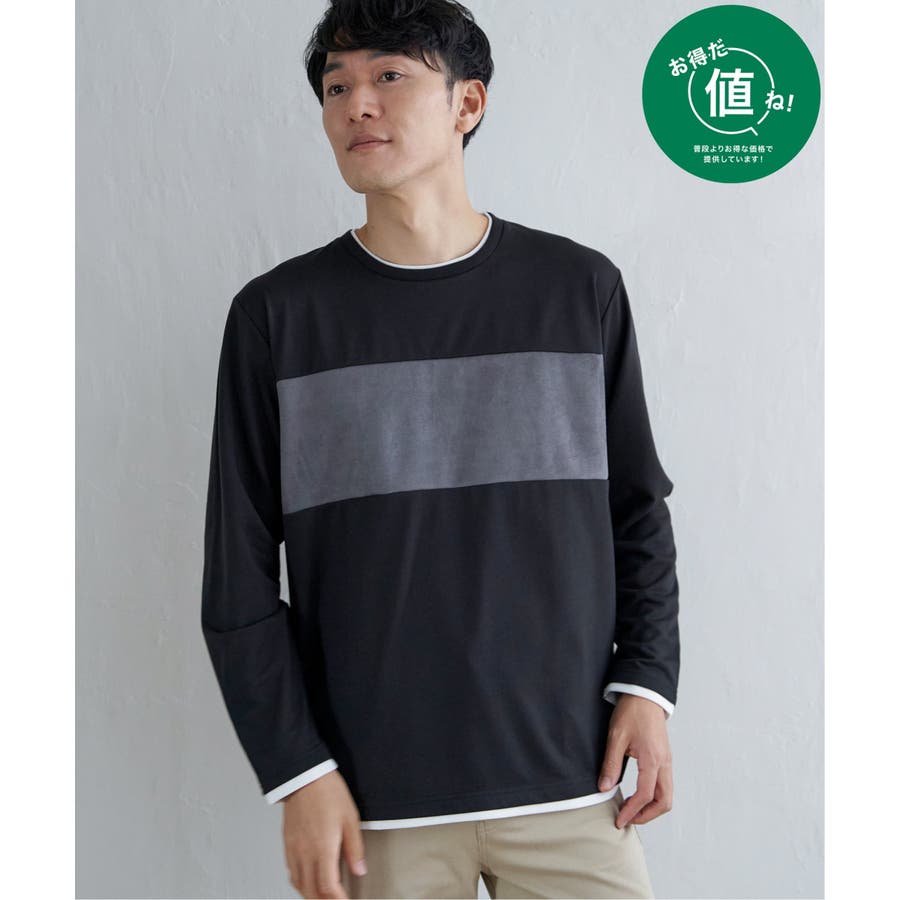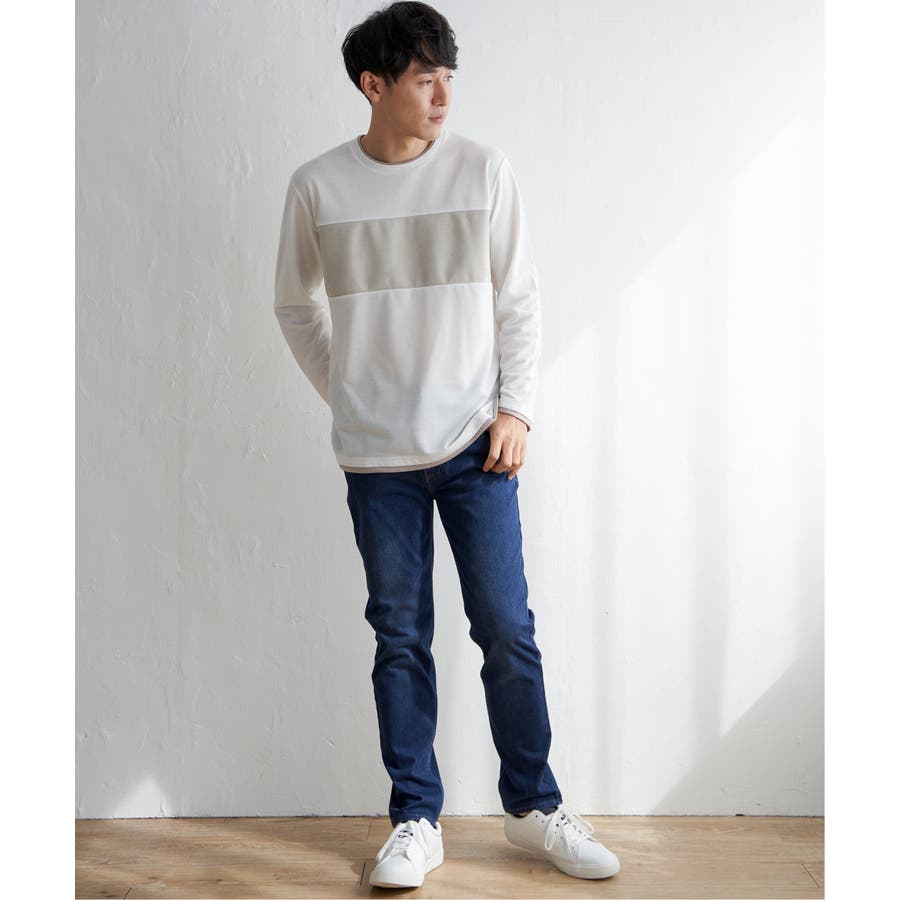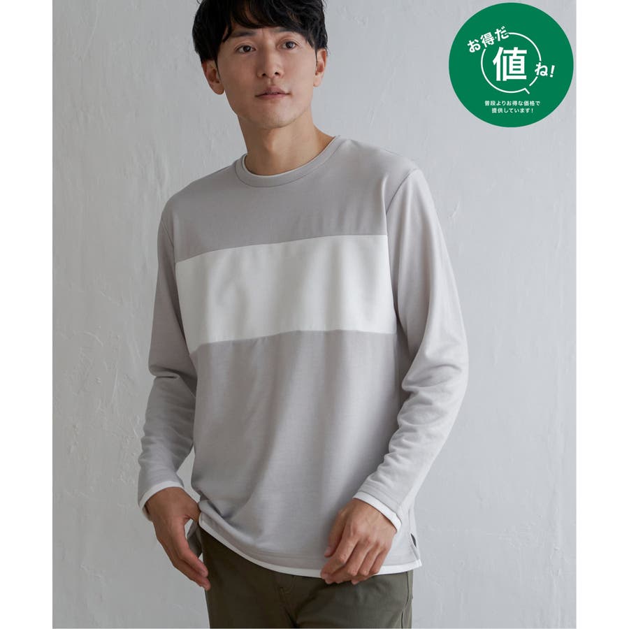異素材切り替えデザインの長袖クルーネックT。