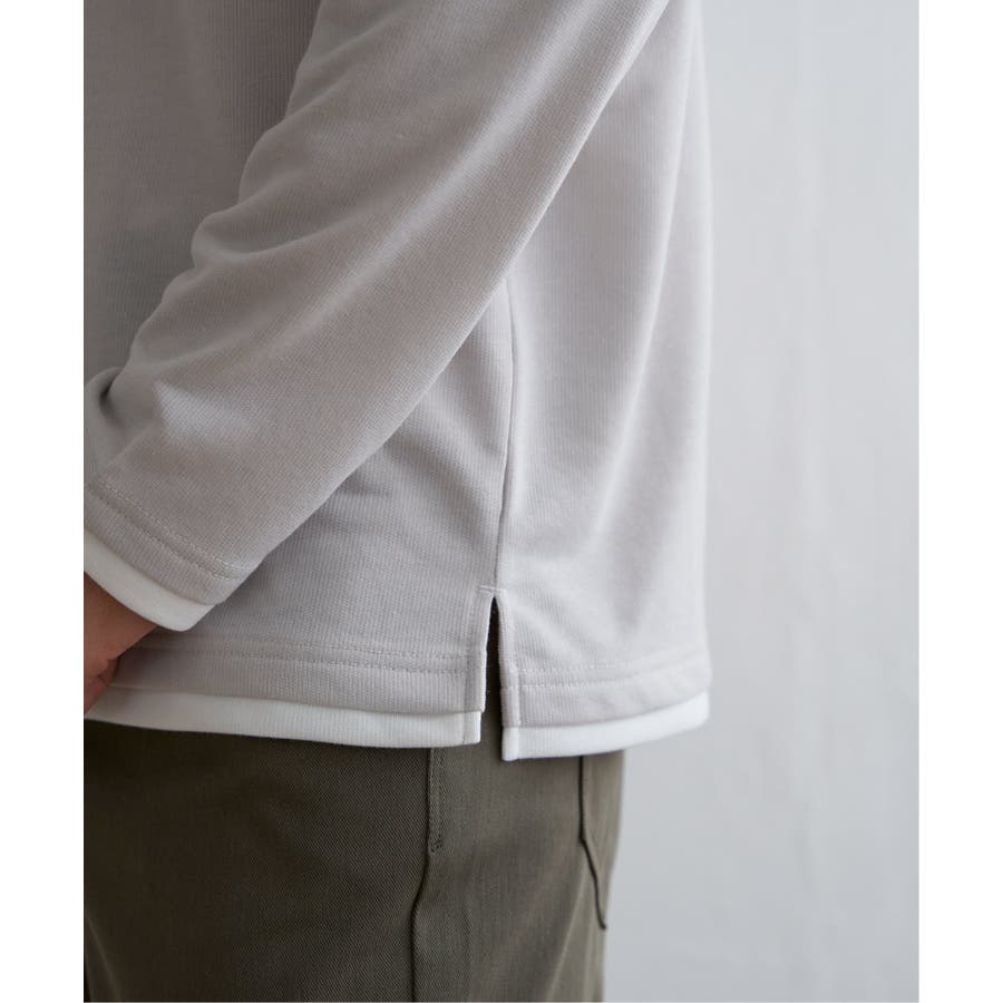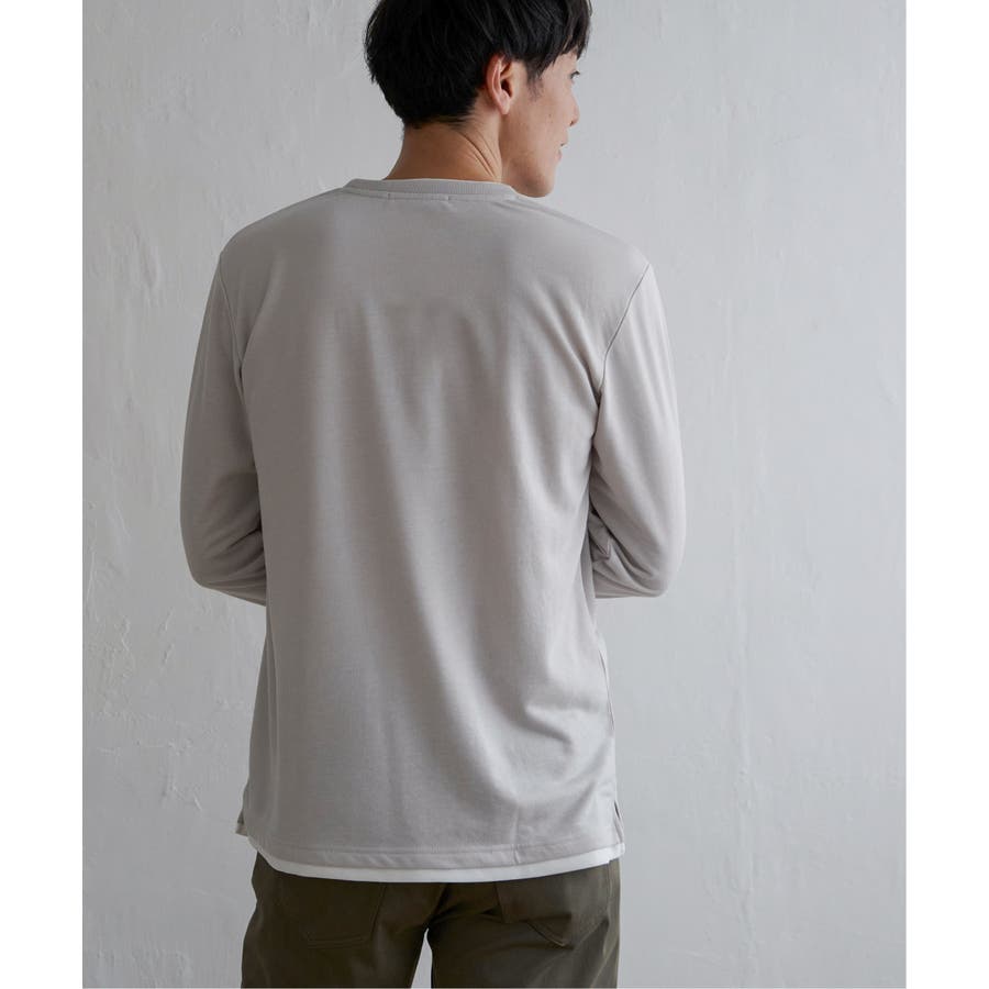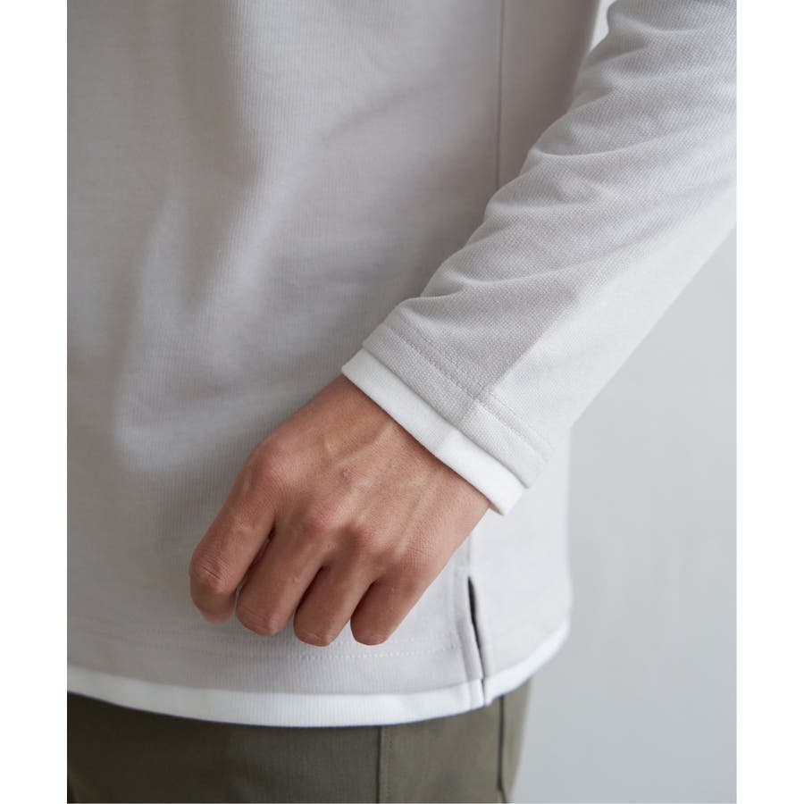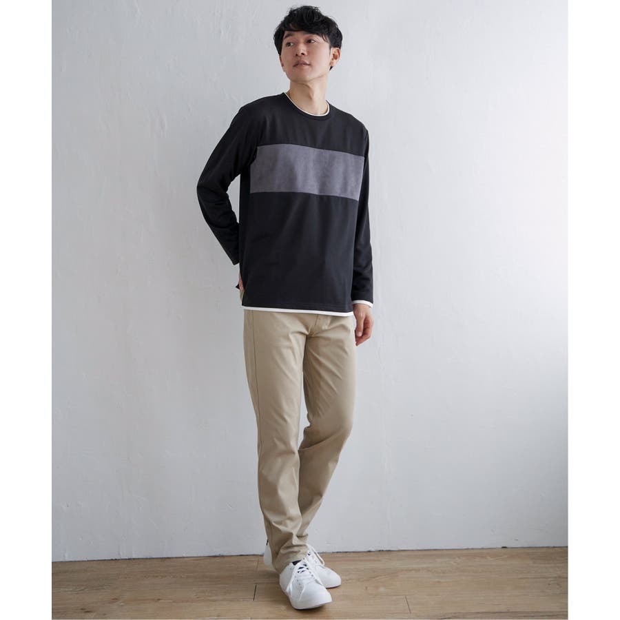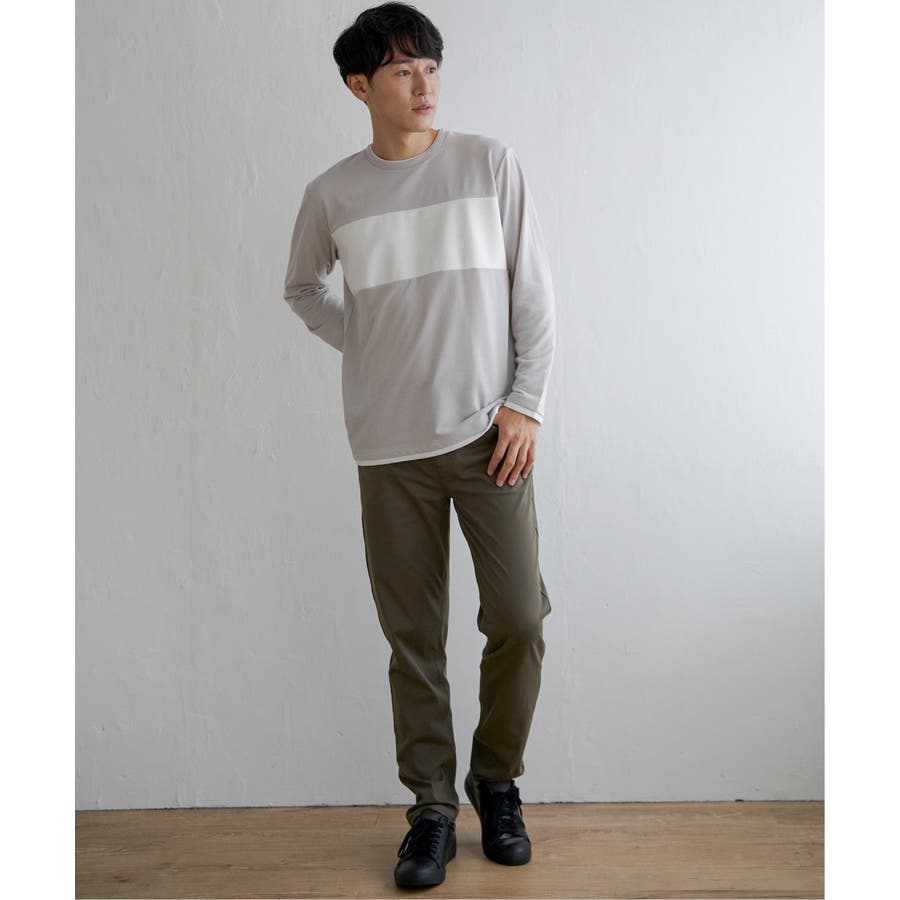 異素材切り替えデザインの長袖クルーネックT。