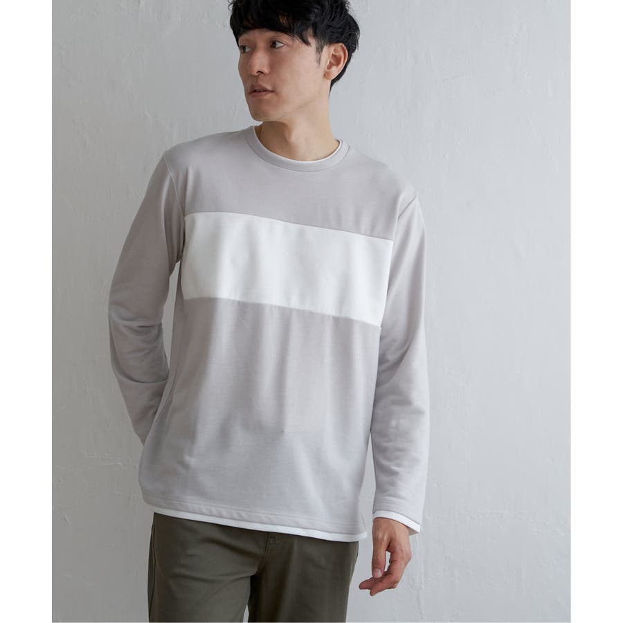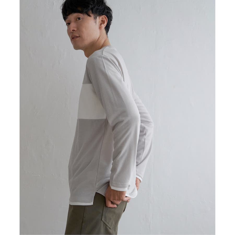 胸部分を異素材で切り替えた長袖クルーネックT。