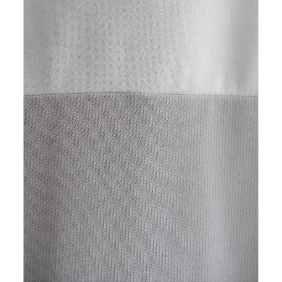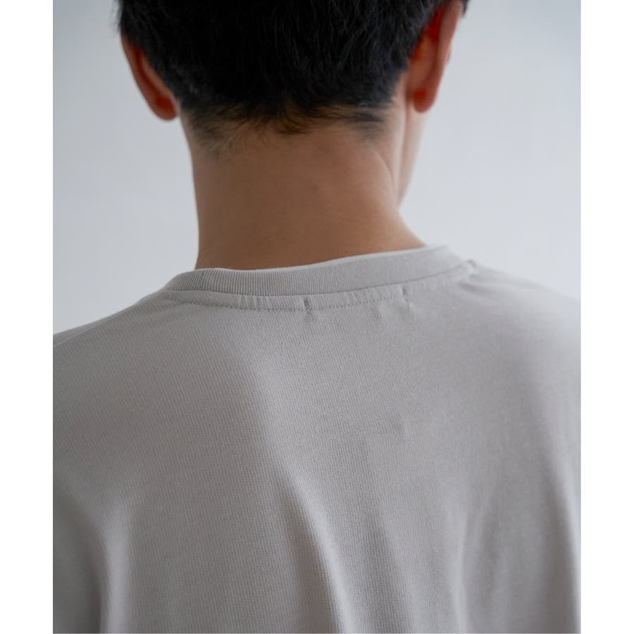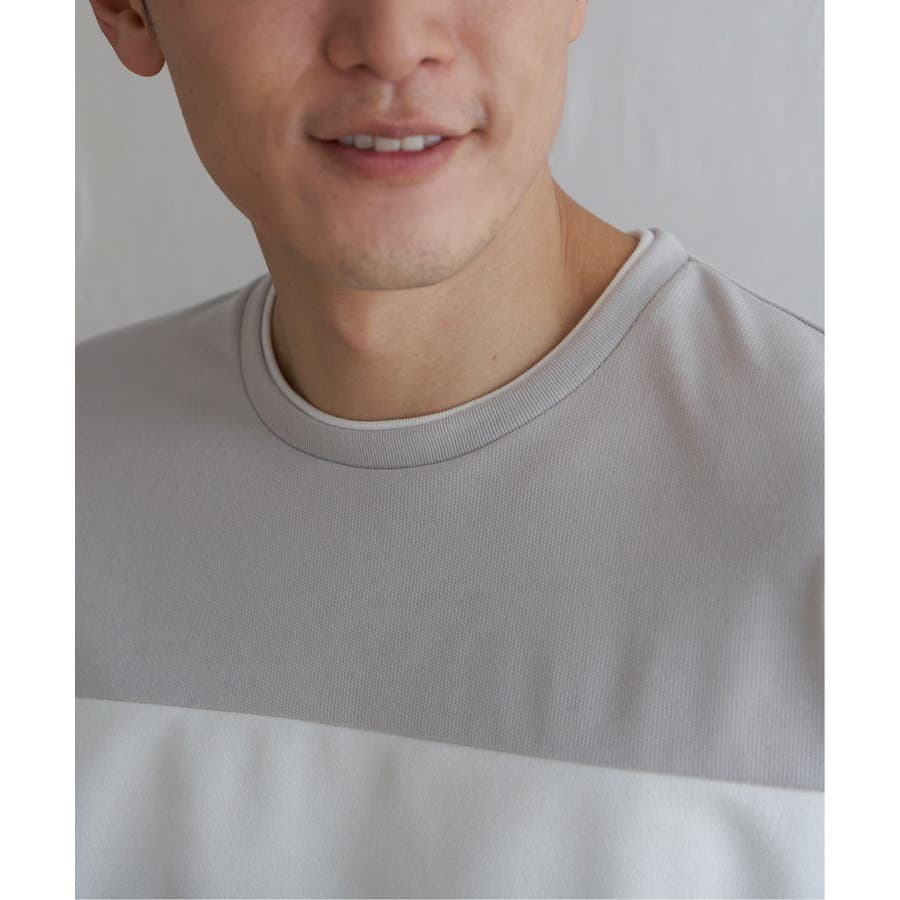 Tシャツにしてはやや厚手のミニ裏毛を使用し、切り替え部分に別地のフェイクスエード素材を配色使いで使用しています。