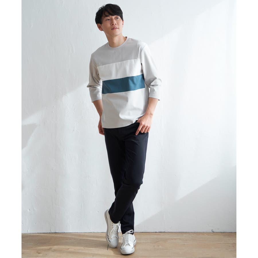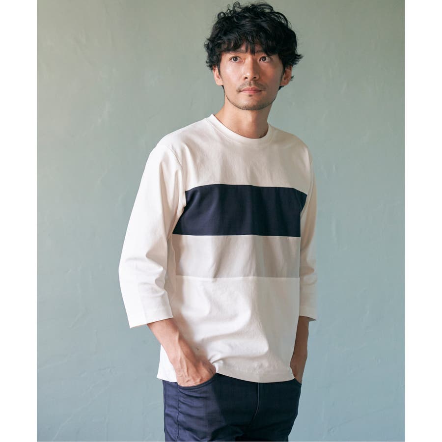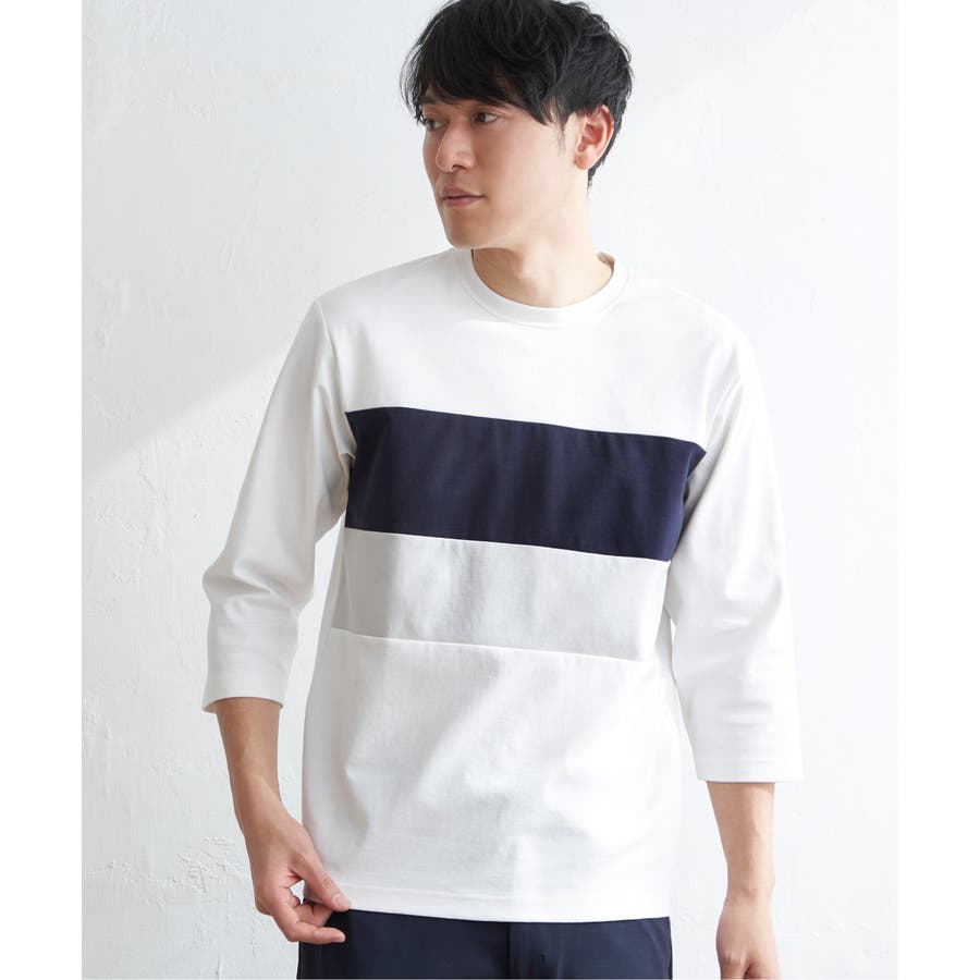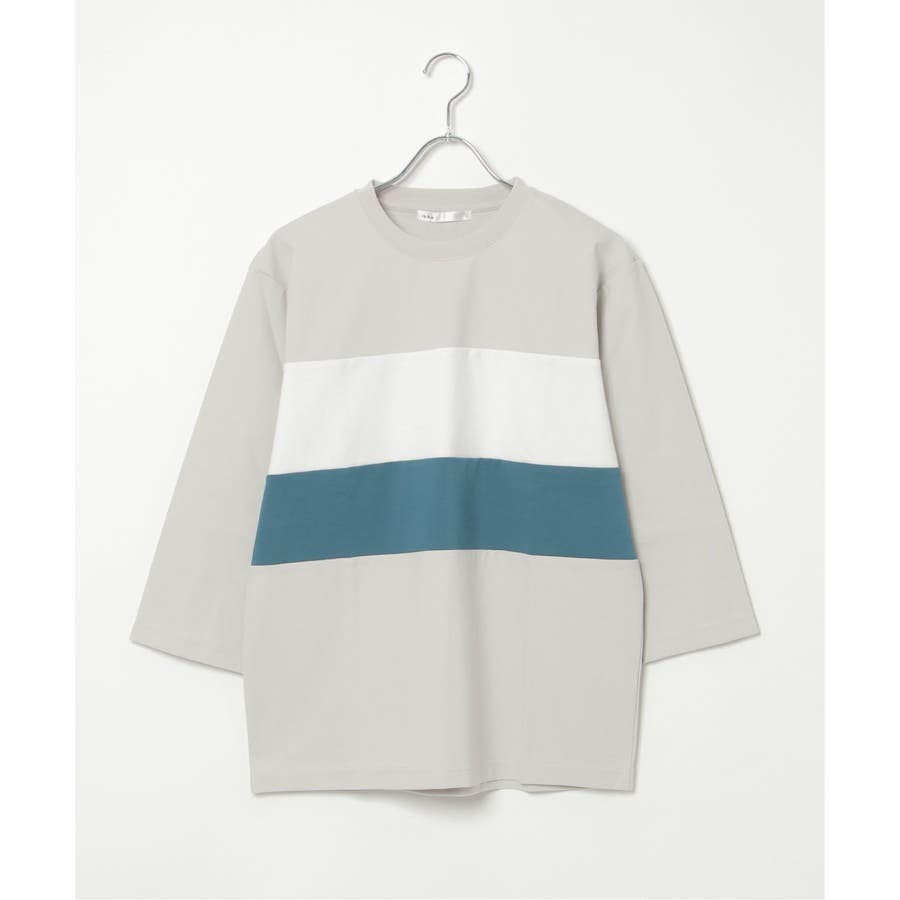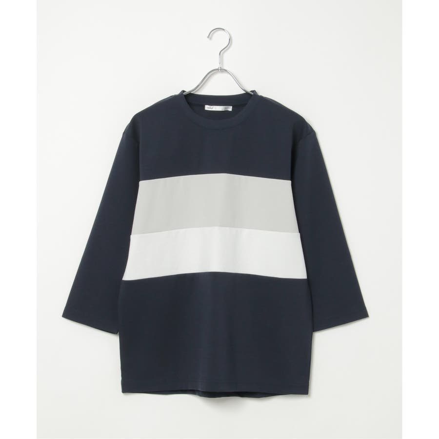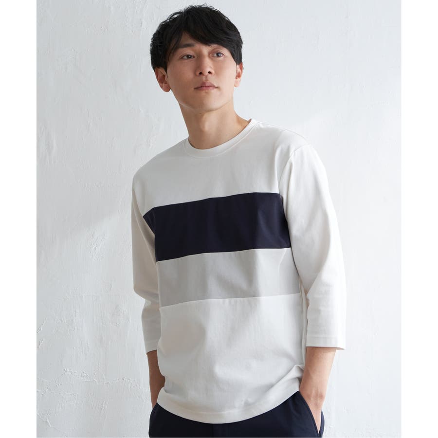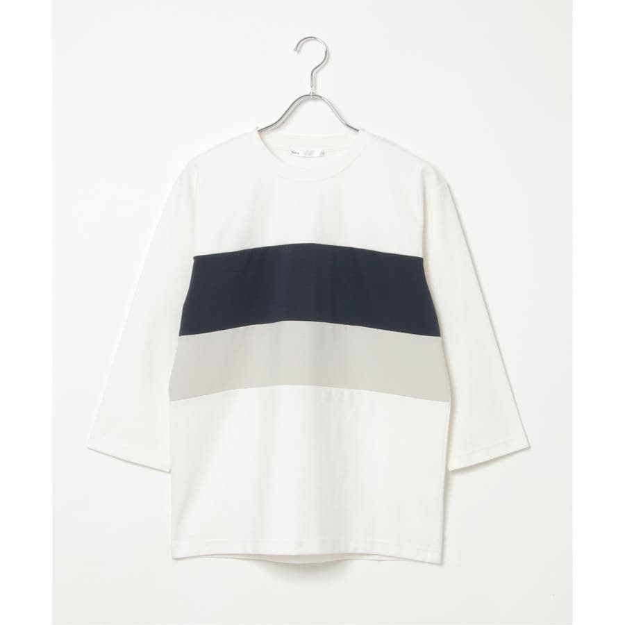 胸部分を切り替えた7分袖のクルーネックTシャツ。