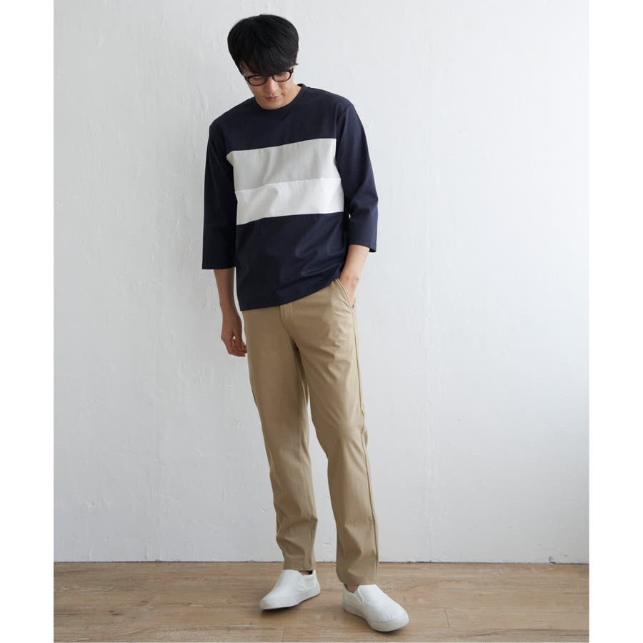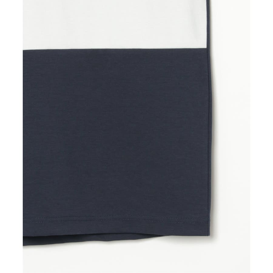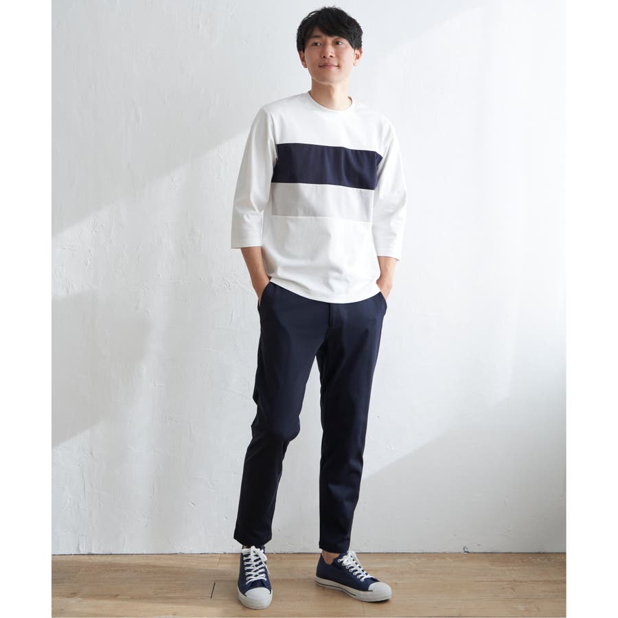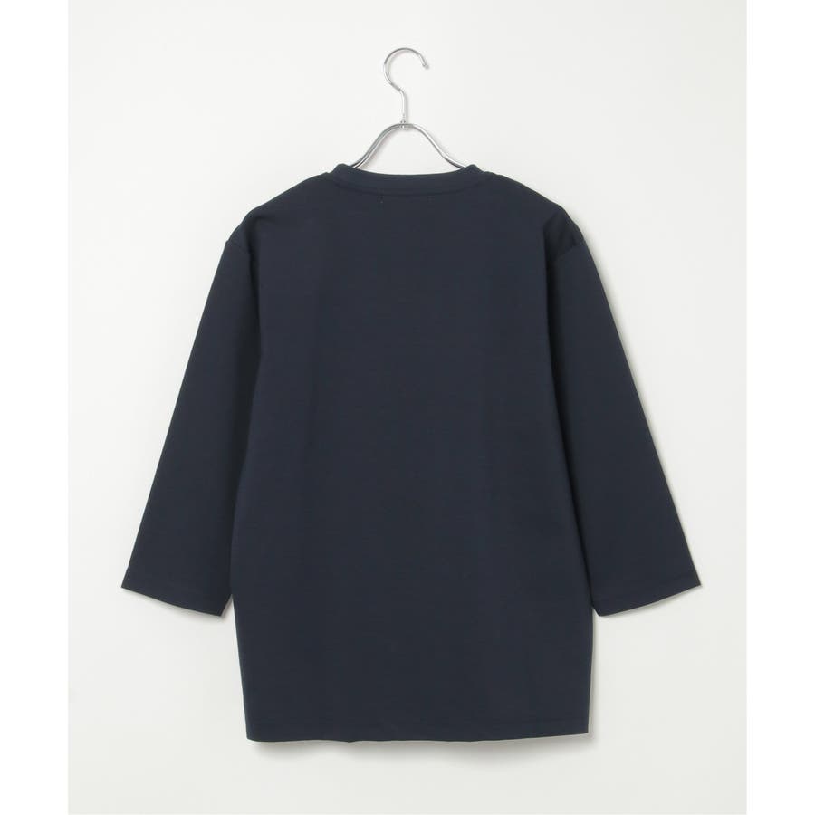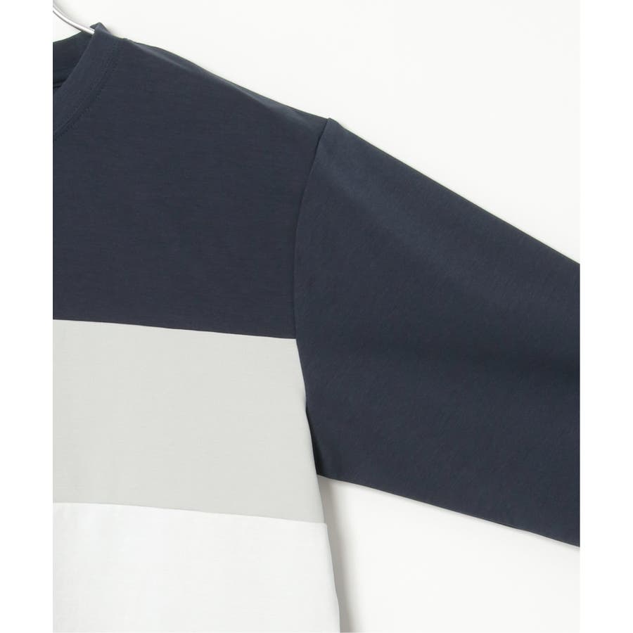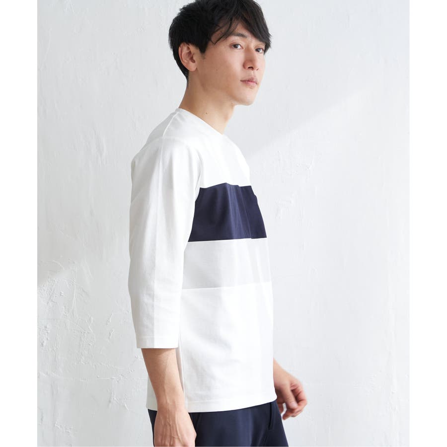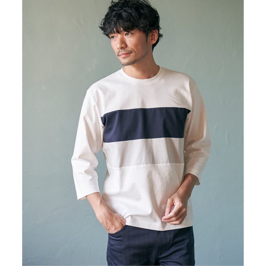 胸部分を切り替えた7分袖のクルーネックTシャツ。