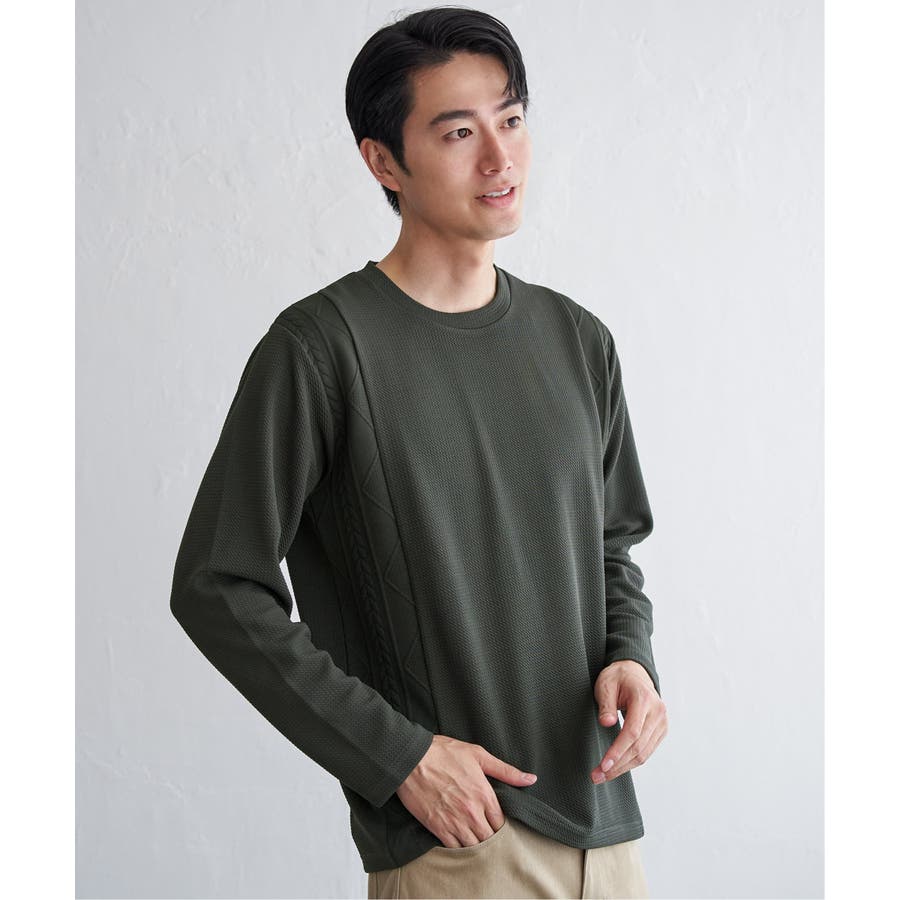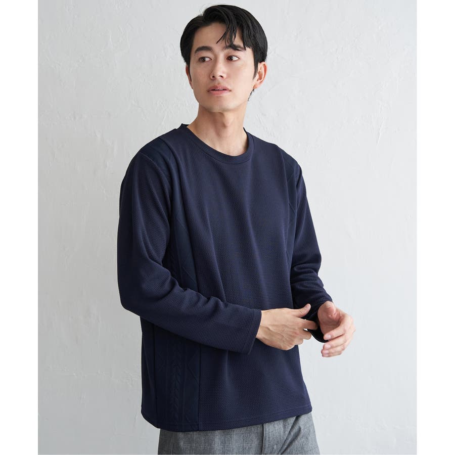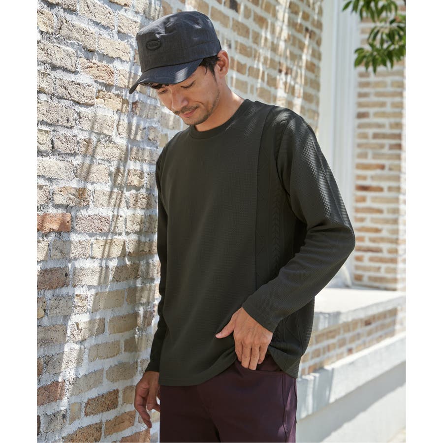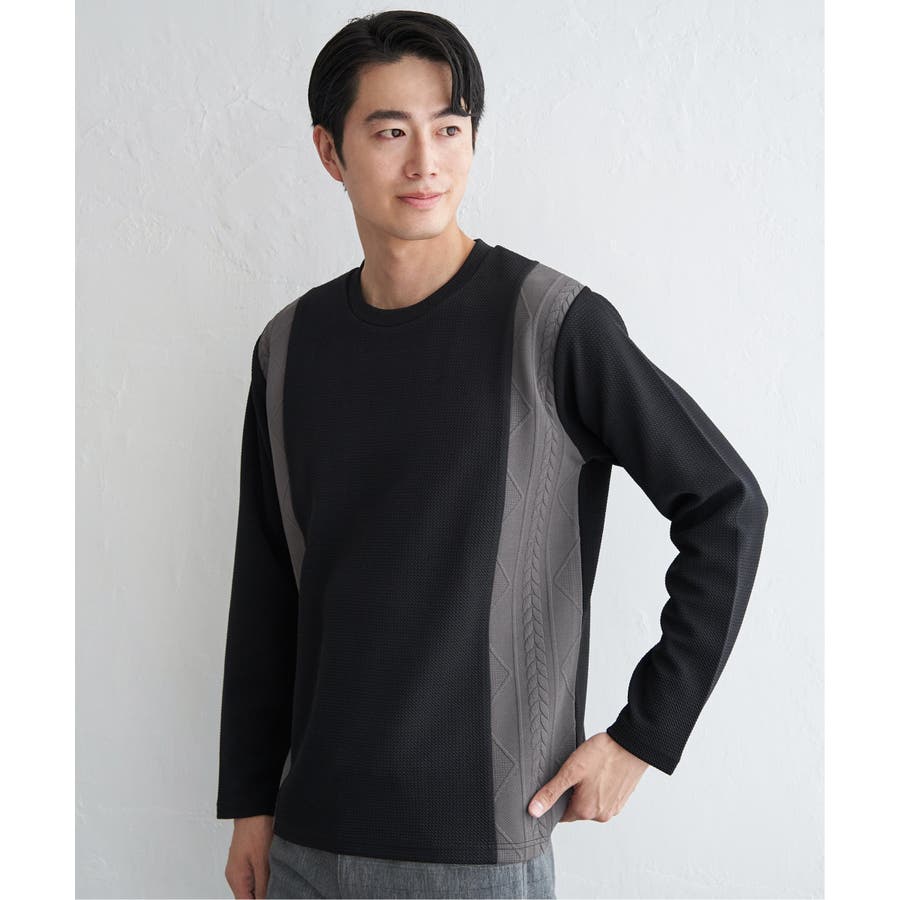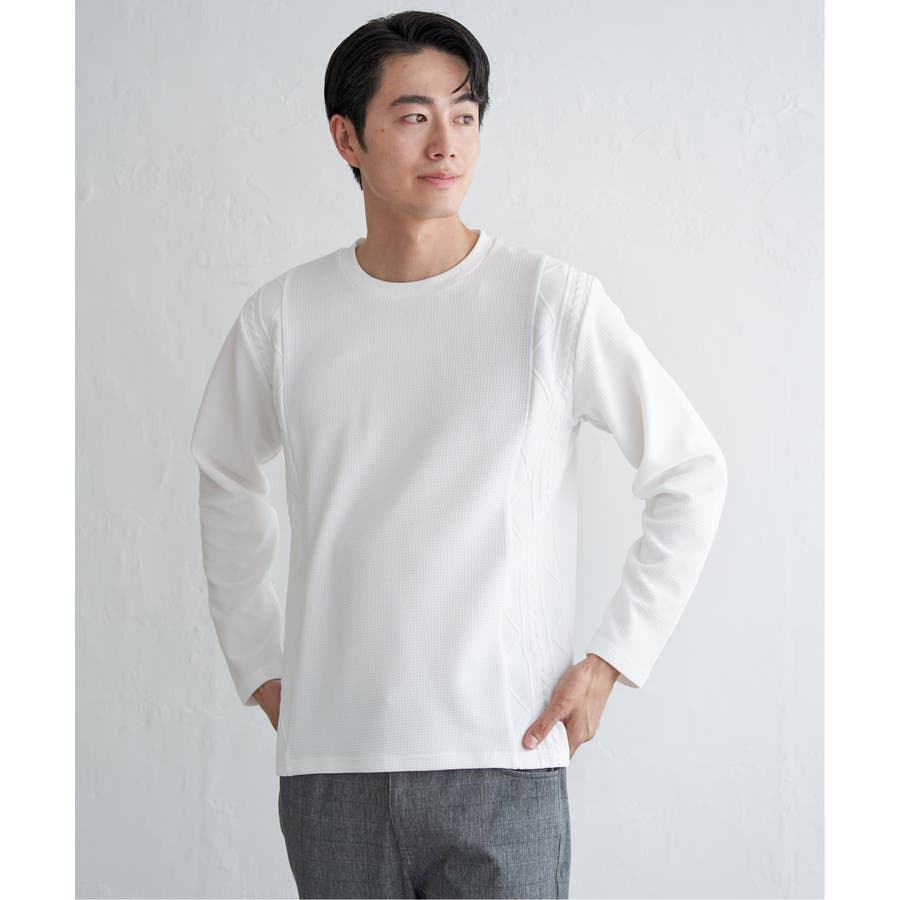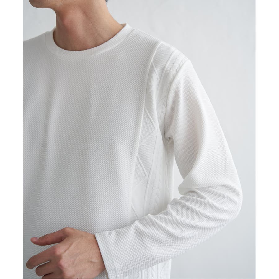 存在感のあるフクレジャカードをベースに、サイドにケーブル柄の異素材を切り替えたロンT。