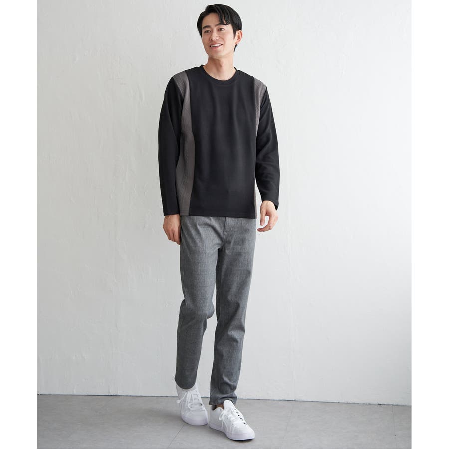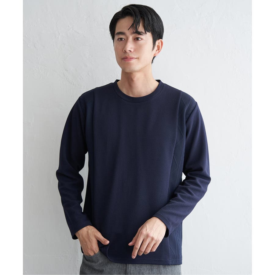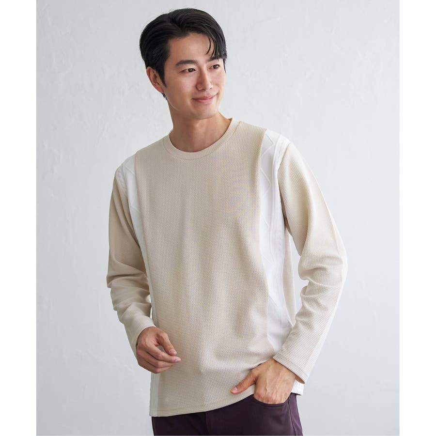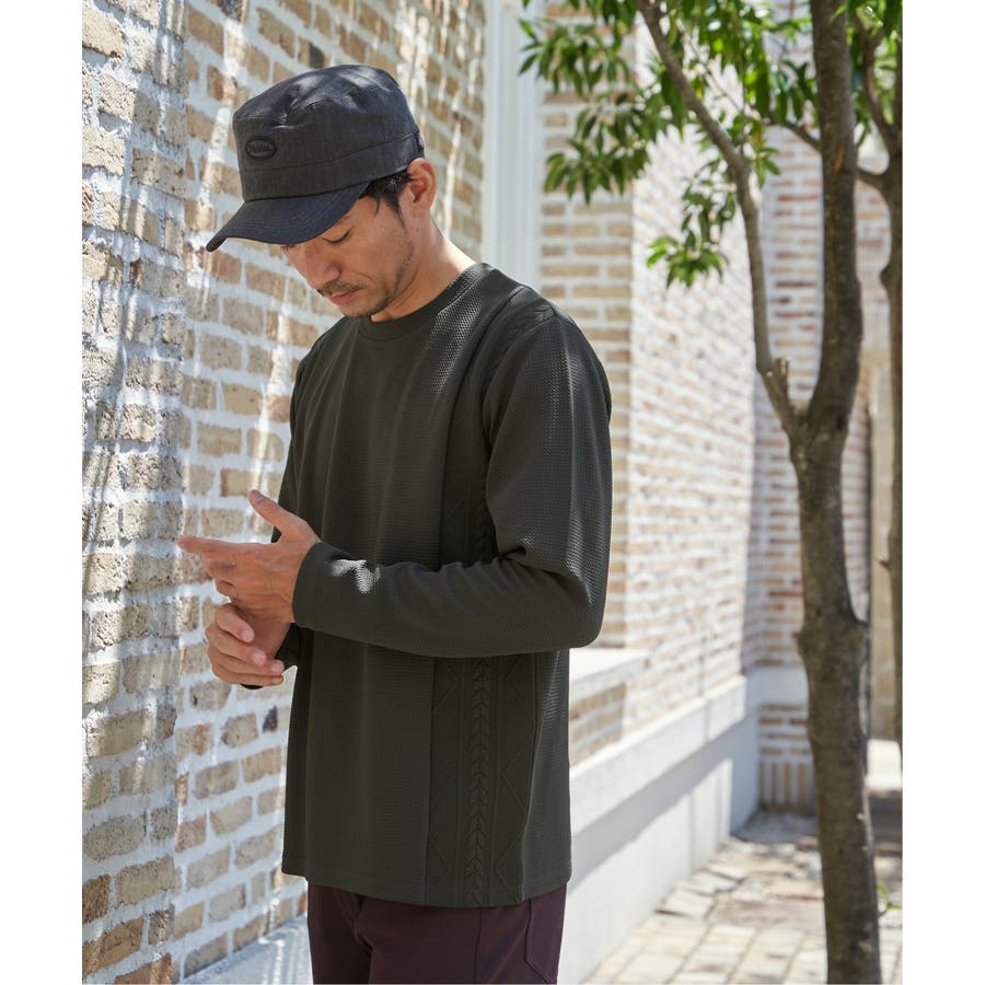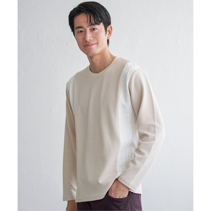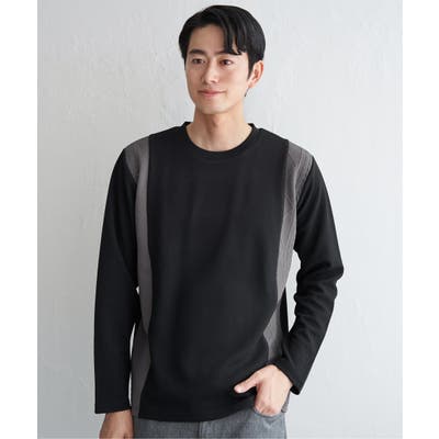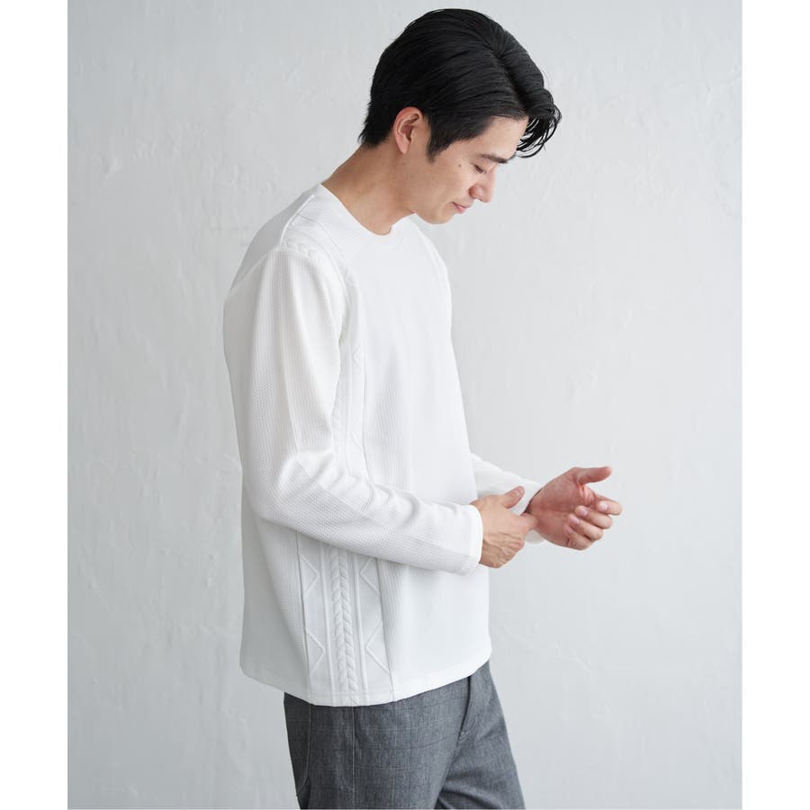 存在感のあるフクレジャカードをベースに、サイドにケーブル柄の異素材を切り替えたロンT。