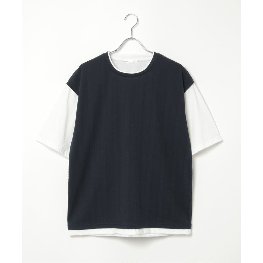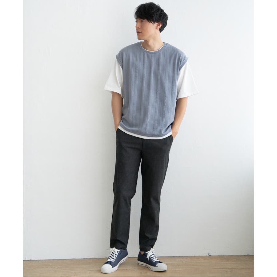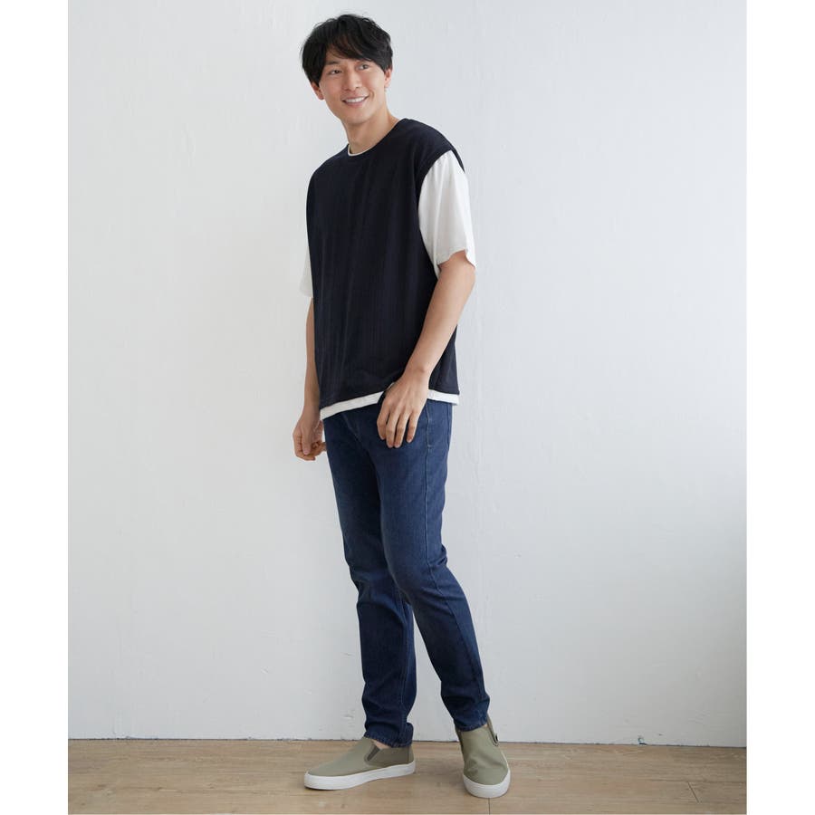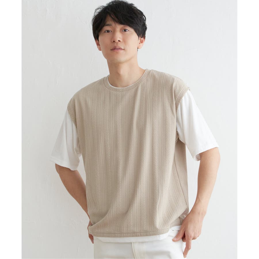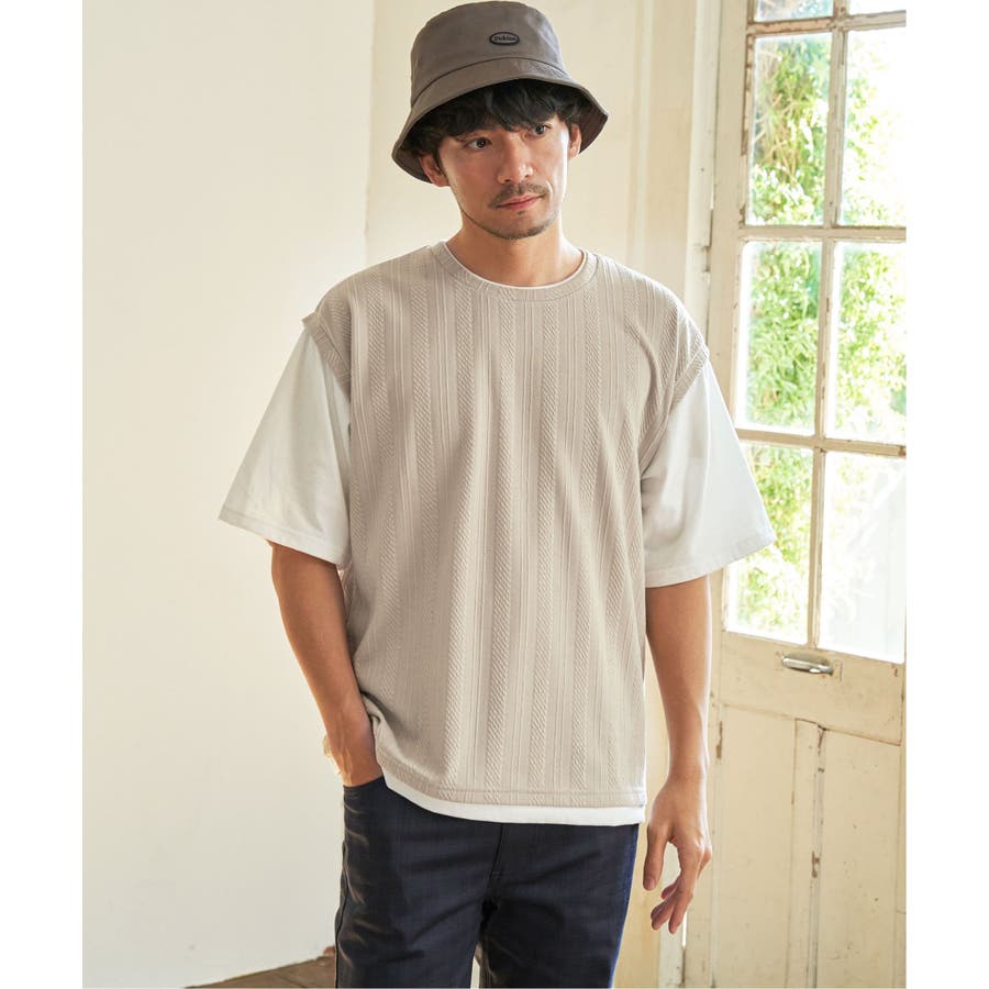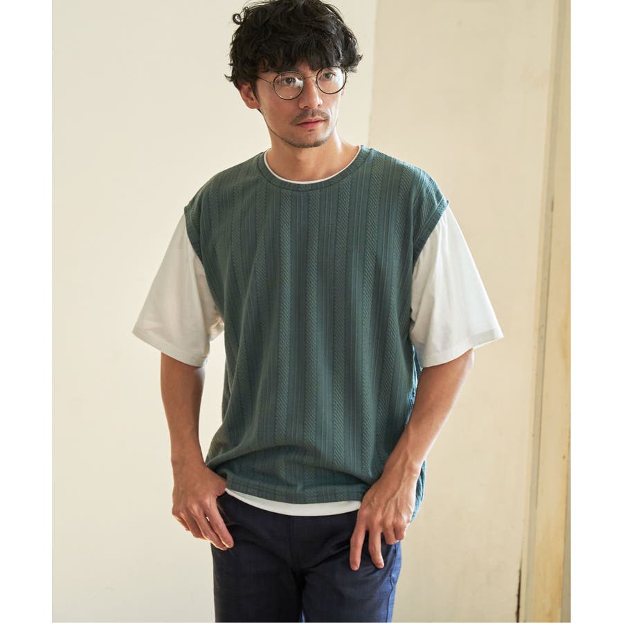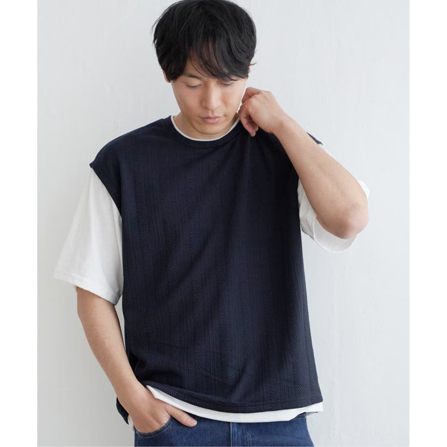 Tシャツとベストを重ね着しているようなフェイクデザイン。