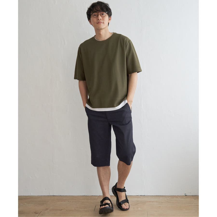 フェイクレイヤードデザインの5分袖Tシャツ。