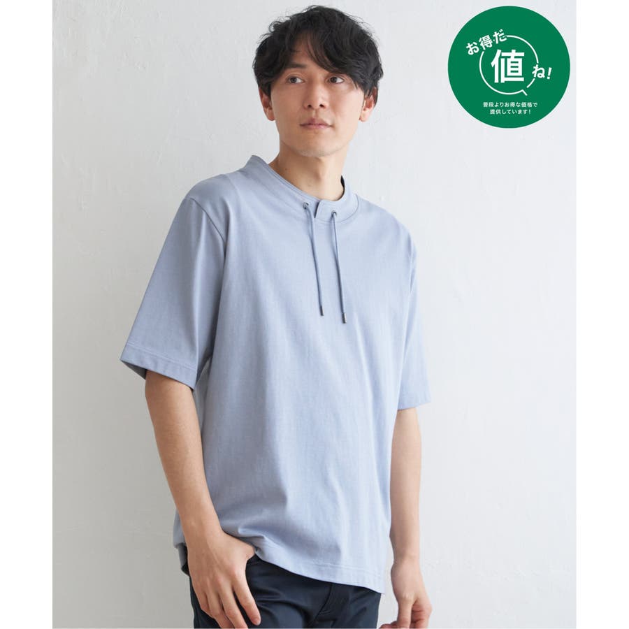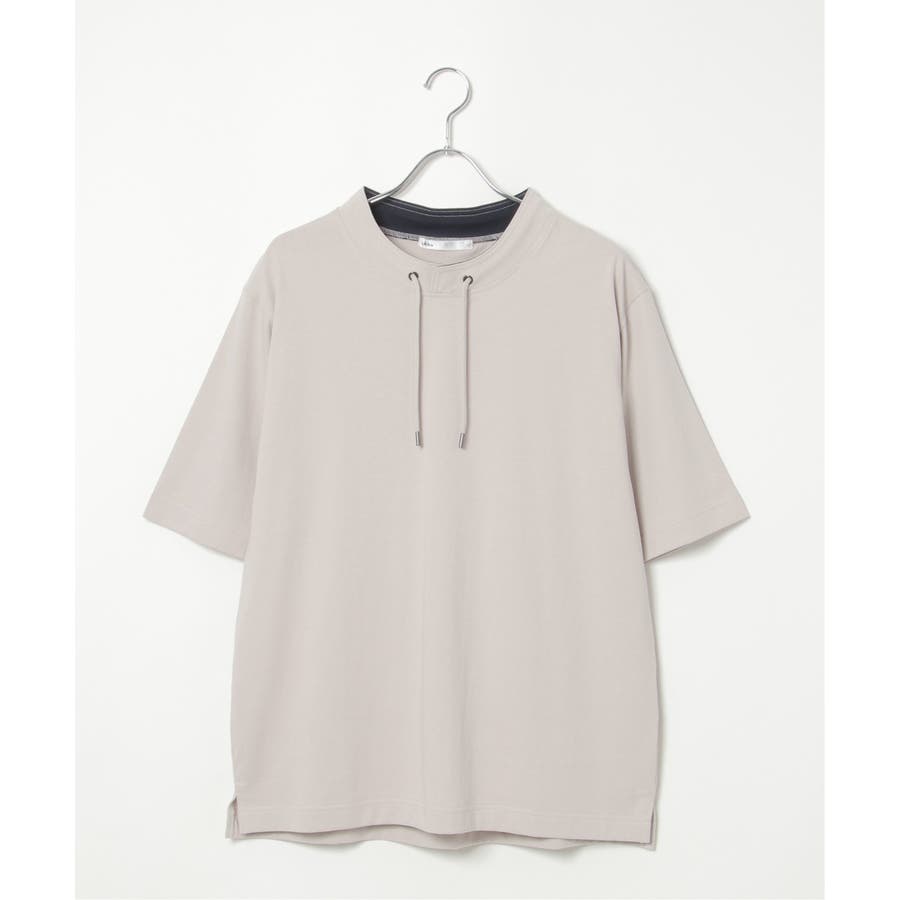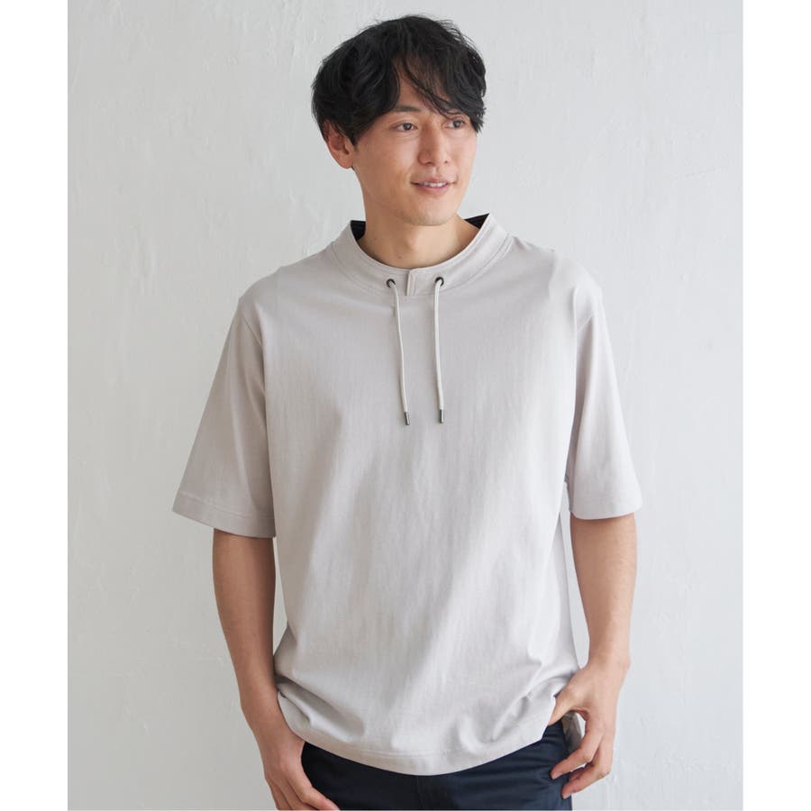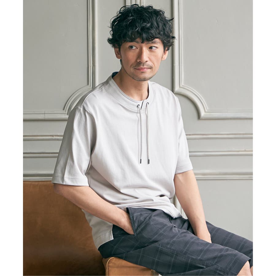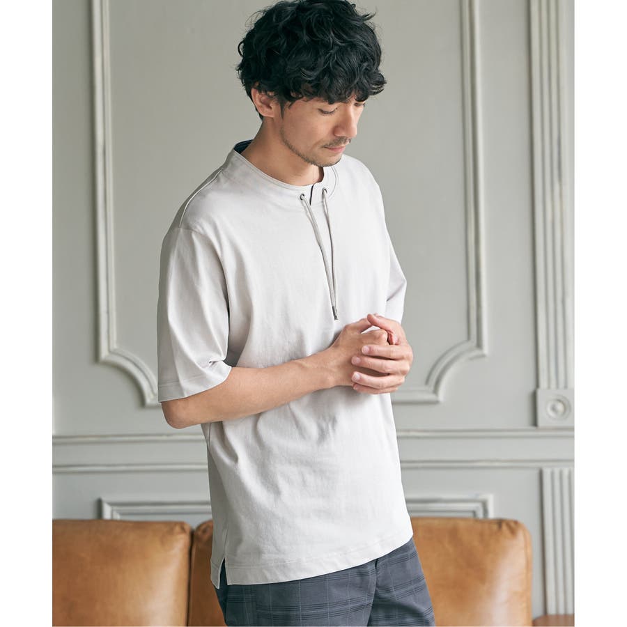 ルーイカラーと呼ばれる、スタンド襟にスピンドル(紐)を通した首回りのデザインが特徴的な5分袖Tシャツ。