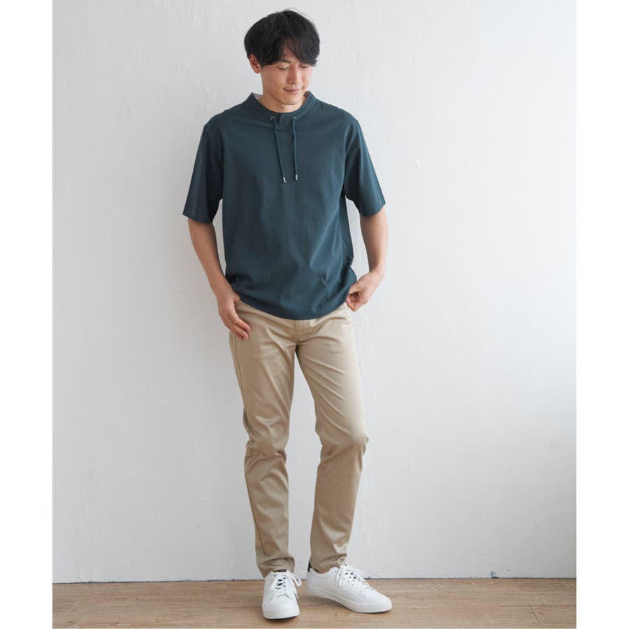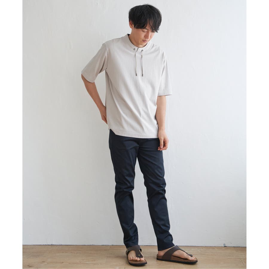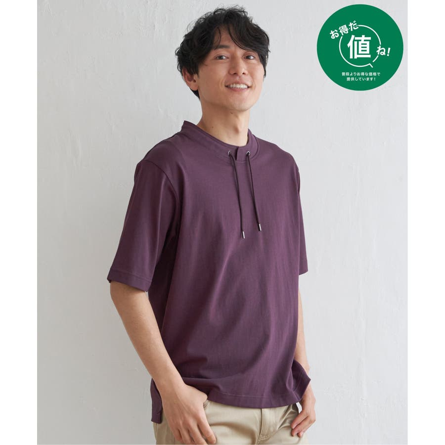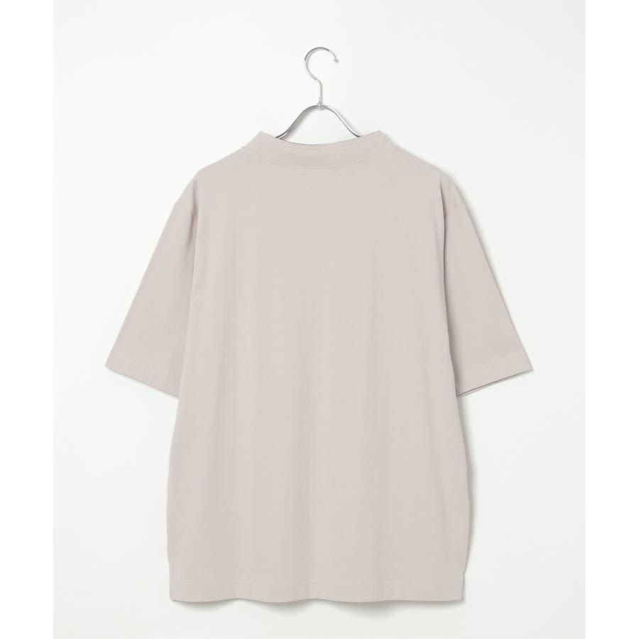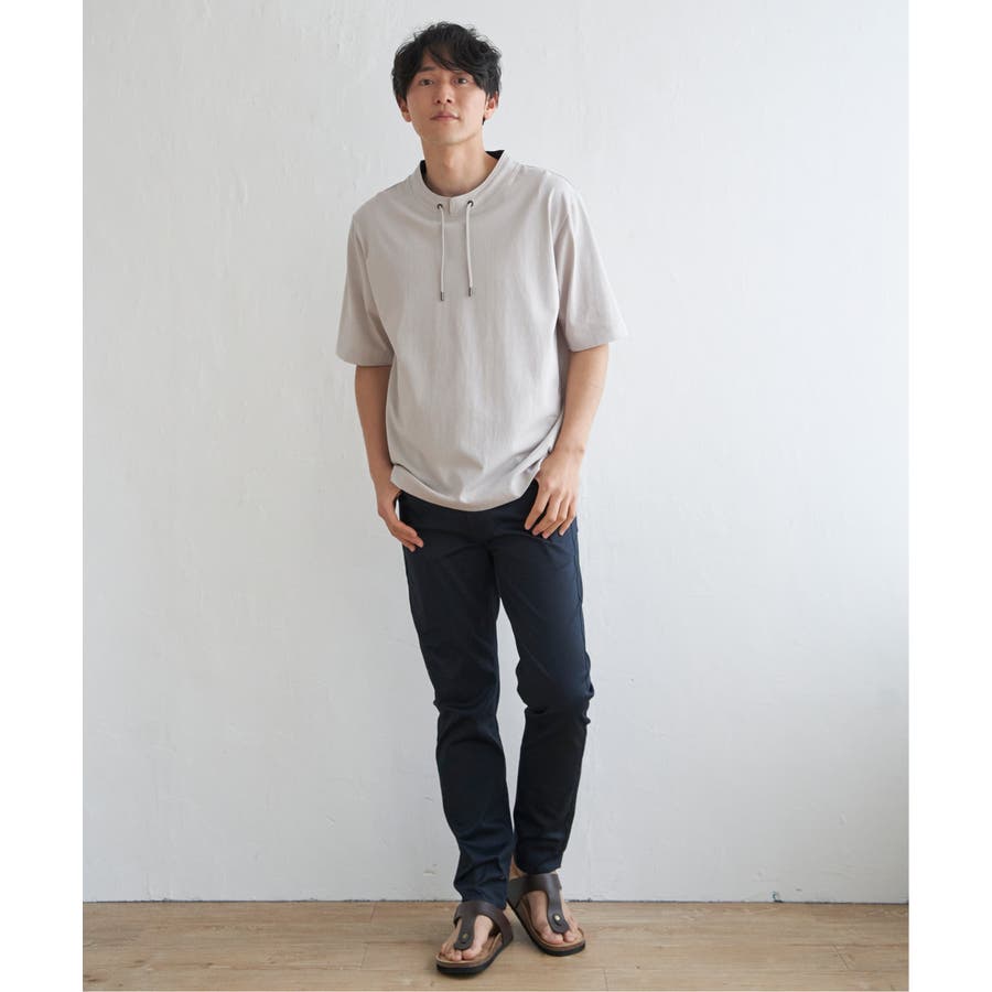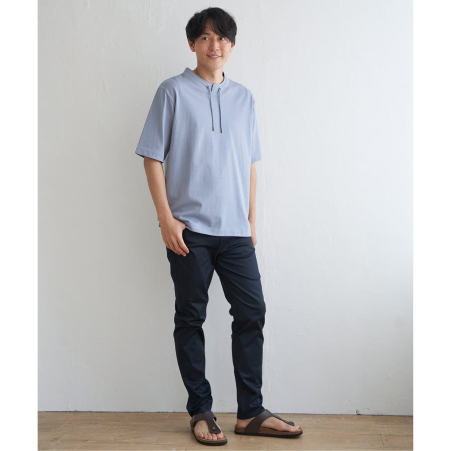 ルーイカラーと呼ばれる、スタンド襟にスピンドル(紐)を通した首回りのデザインが特徴的な5分袖Tシャツ。